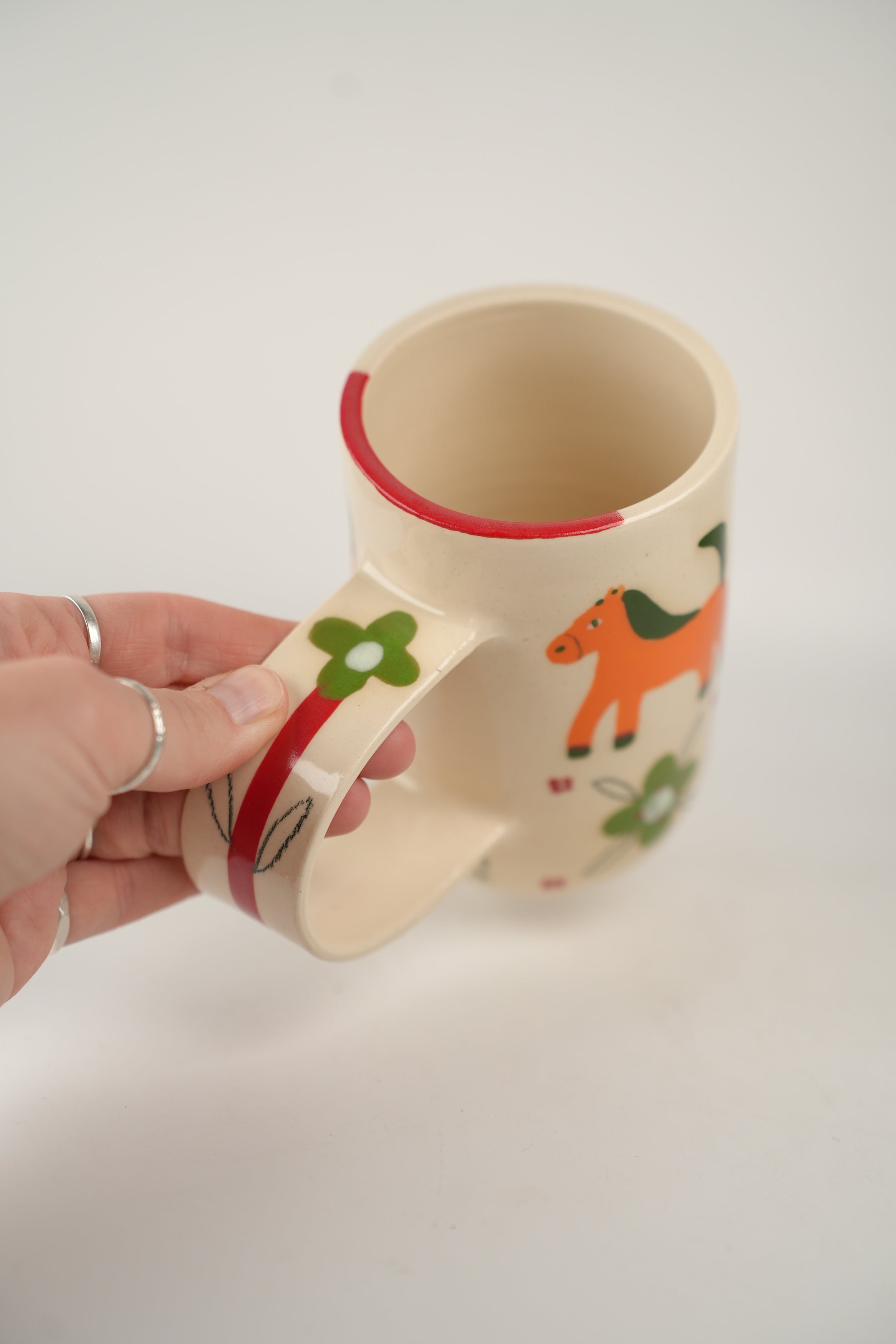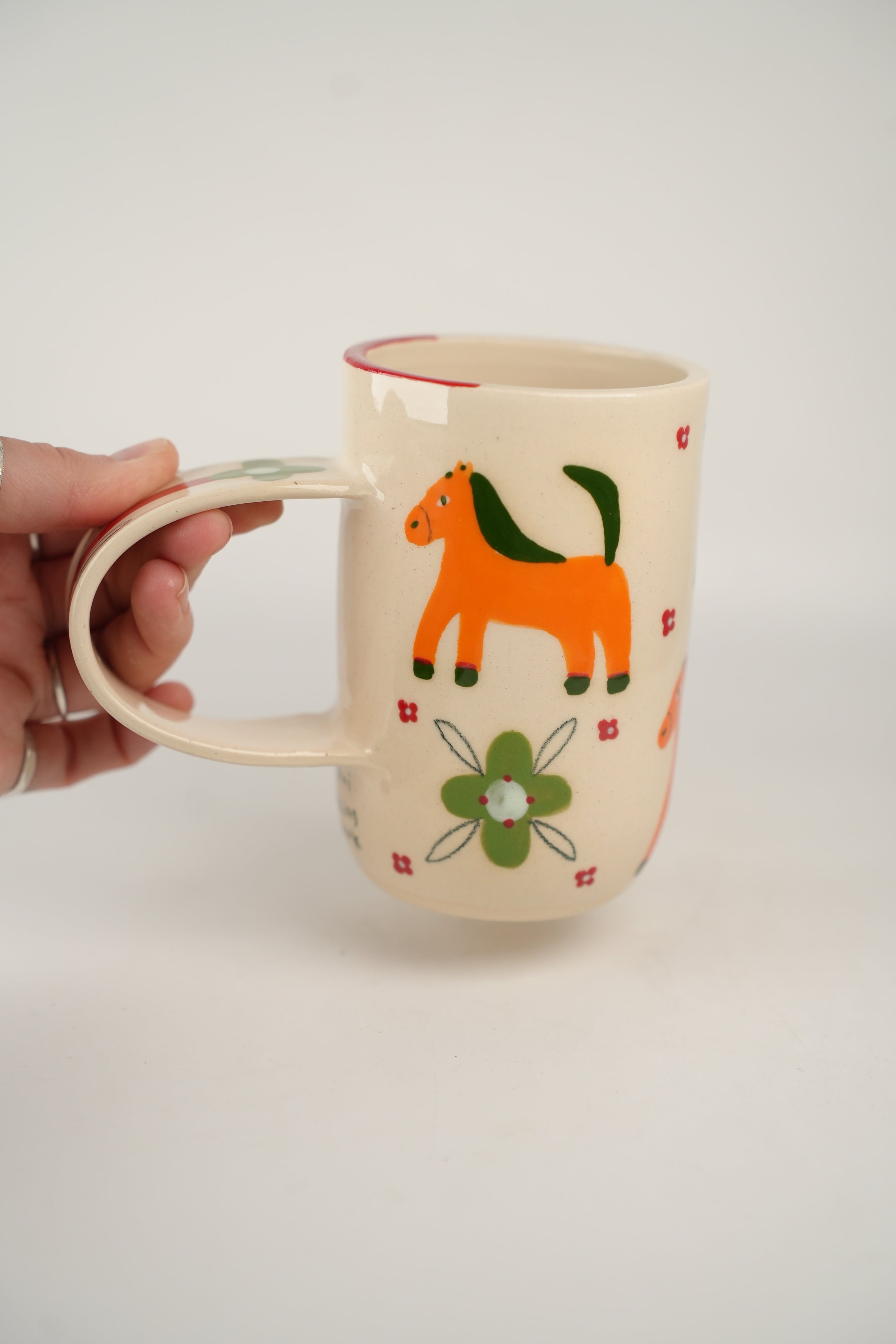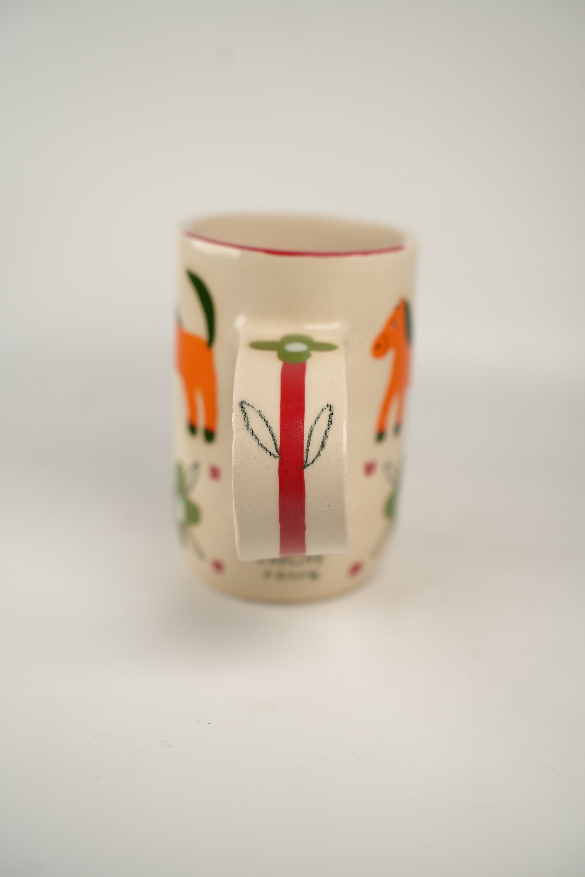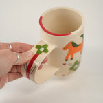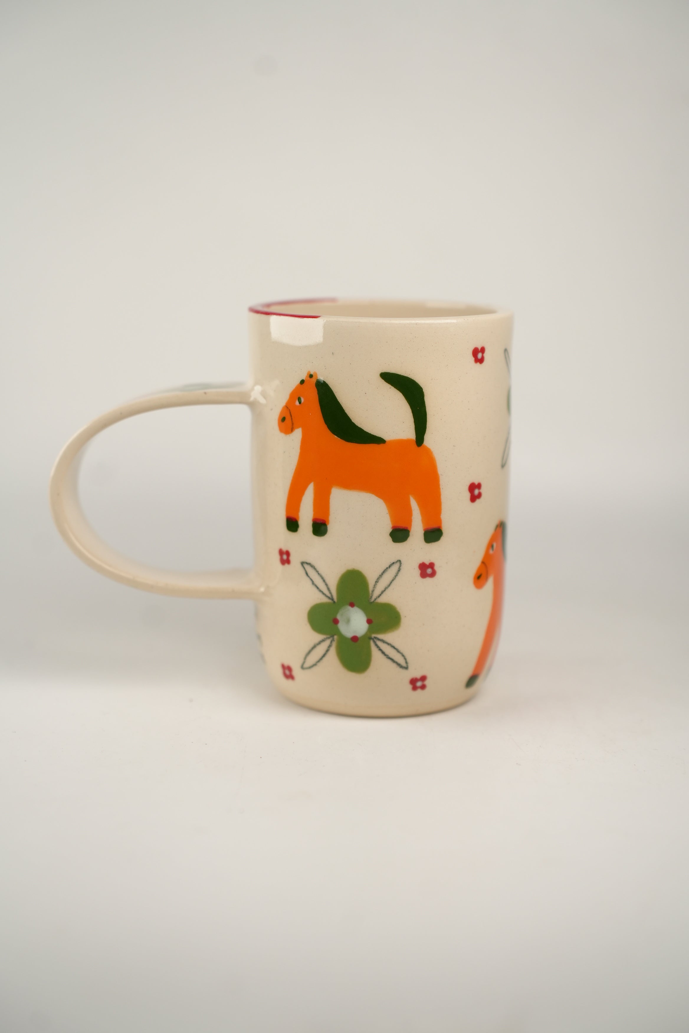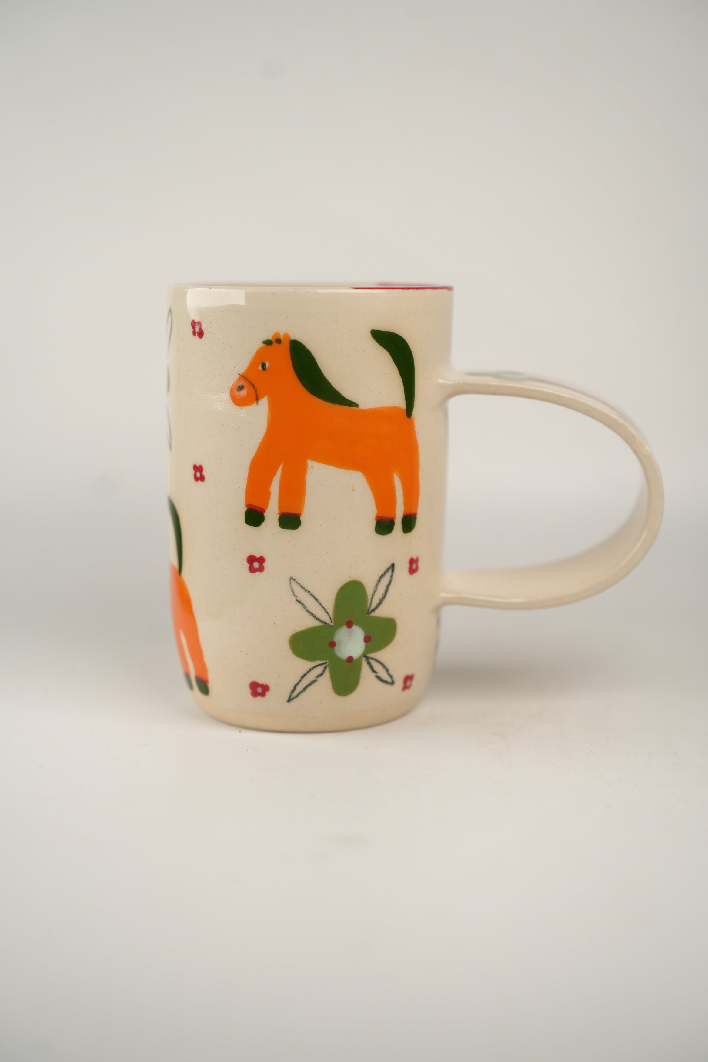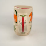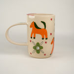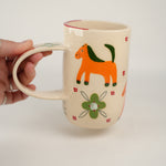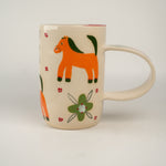 Horses and patterns oh my! Tall and slim shape with shiny cream base. Exaggerated and elongated circular handle. Handle has a single flower, with a looooong red stem and green bloom! Body of mug is checkerboard of adorable orange horses and green fleurs. Clusters for four red dots frame each “check.”