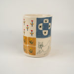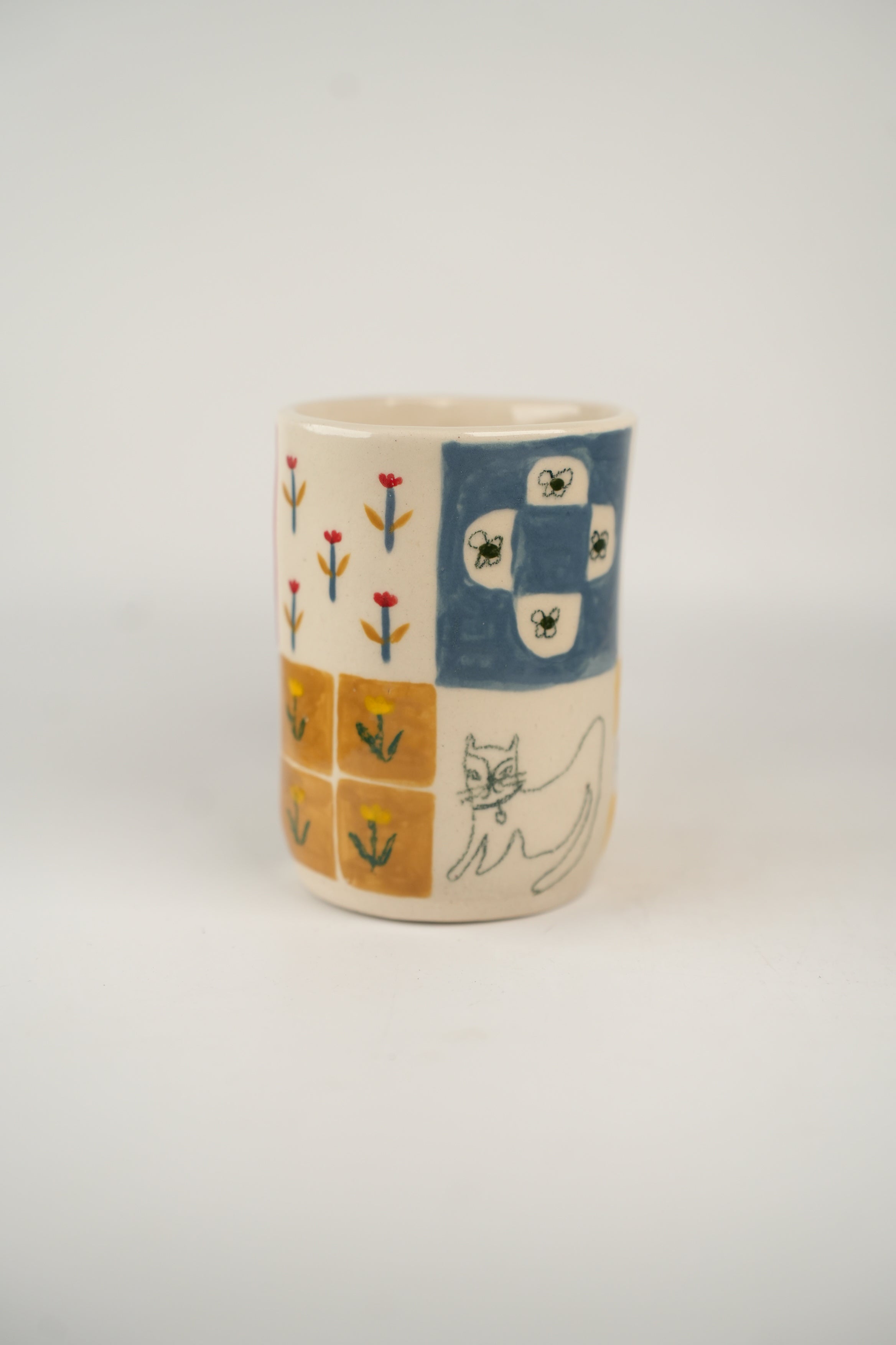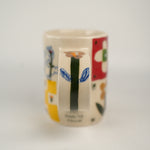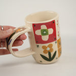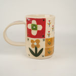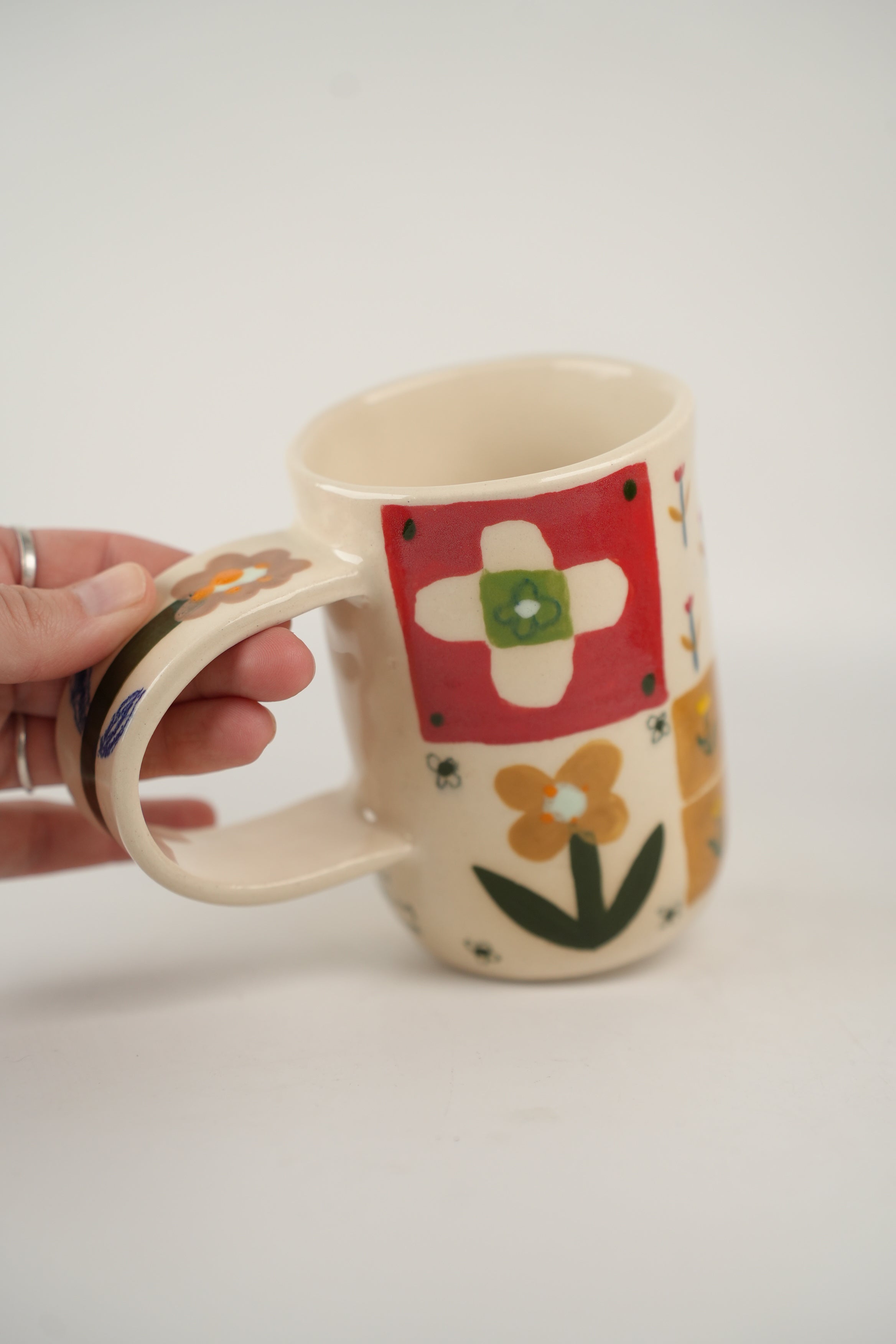 Flower patches galore. Tall and slim shape with shiny cream base. Exaggerated and elongated circular handle. Handle has a single flower with a looooong dark green stem, blue scribble leaves, and a mustard bloom. Body of mug is checkerboard of flower patches: green tiles with orange flowers, a cluster of orange fleurs, a large mustard tulip, a red square with a white flower—- so many many!