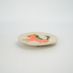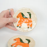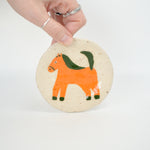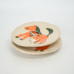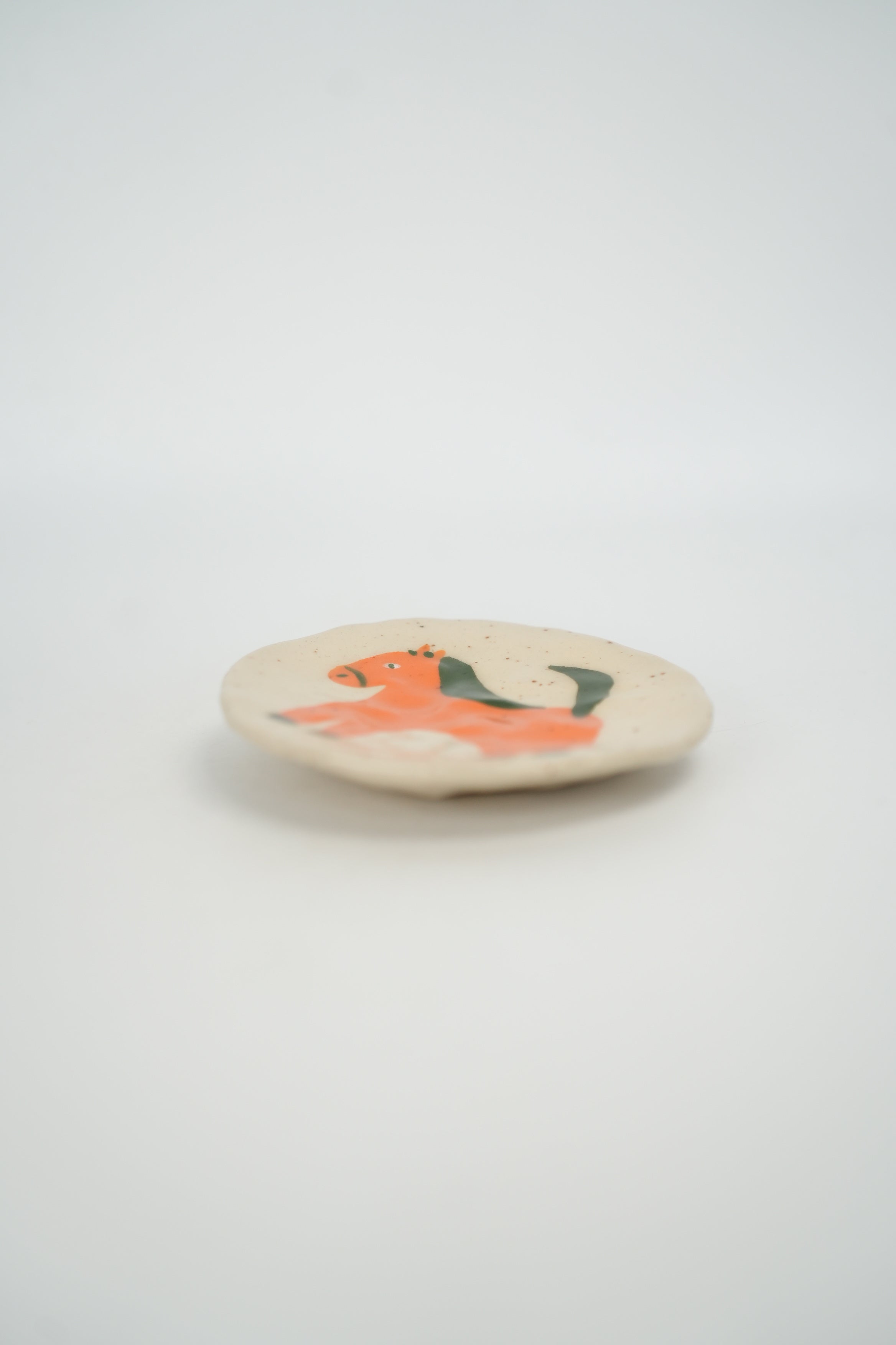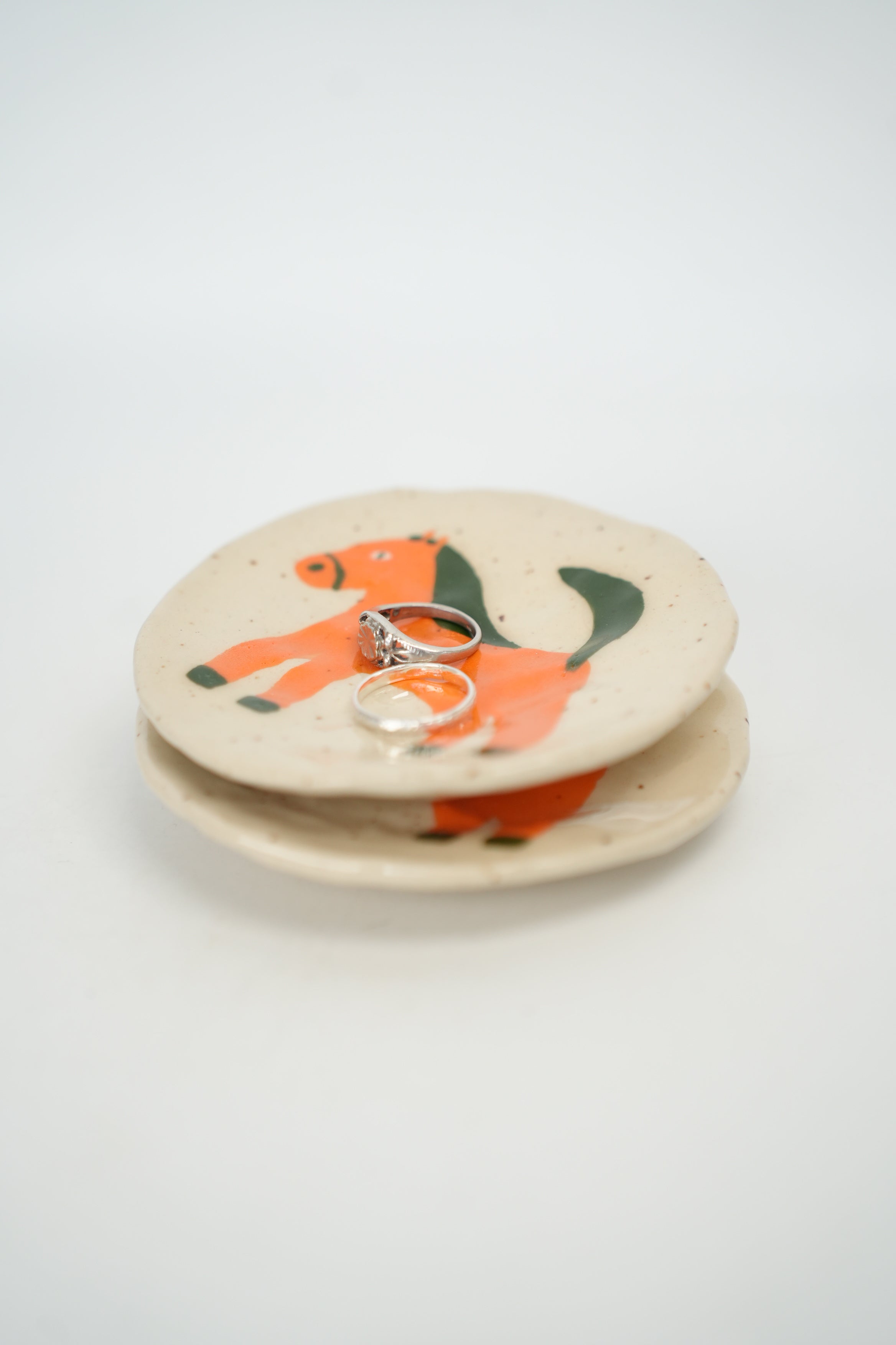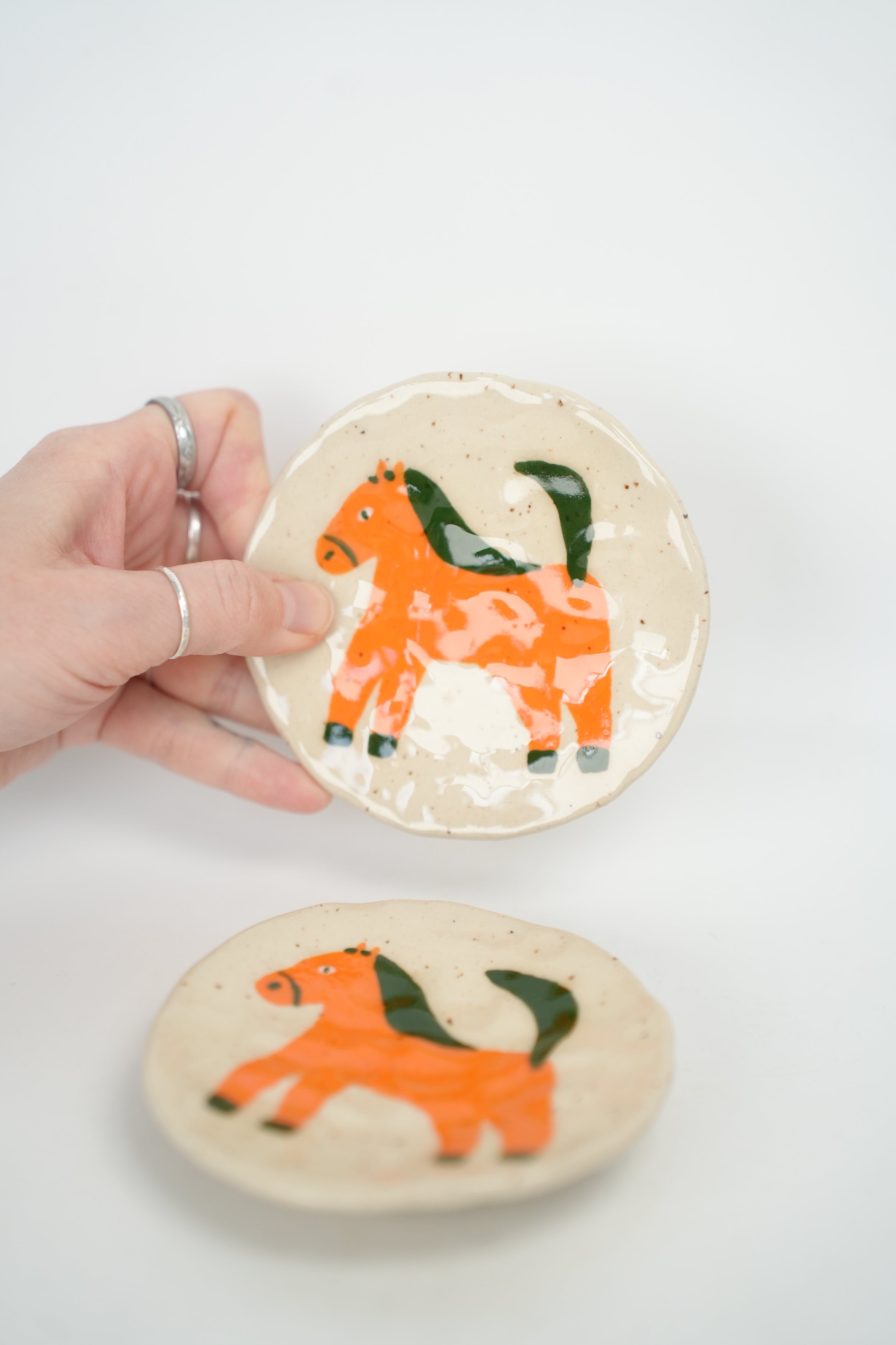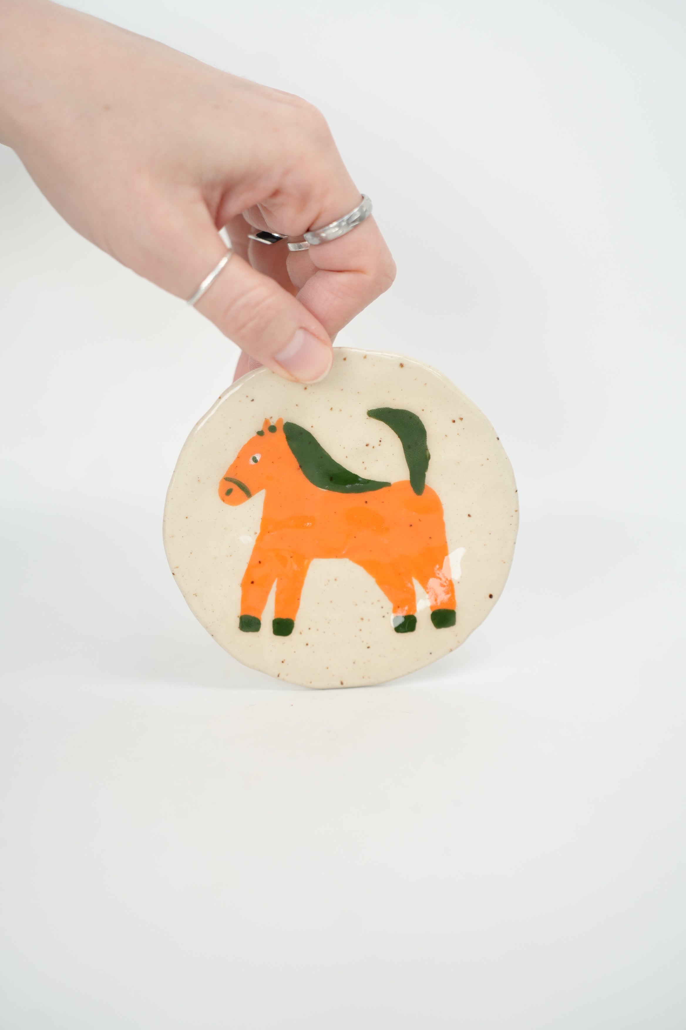 Shiny speckled cream hand built plate with slightly raised lip. Lovely painting of bright orange horse. Dark mane, hooves, and very upright tail!
