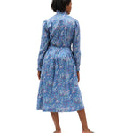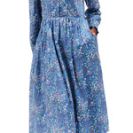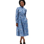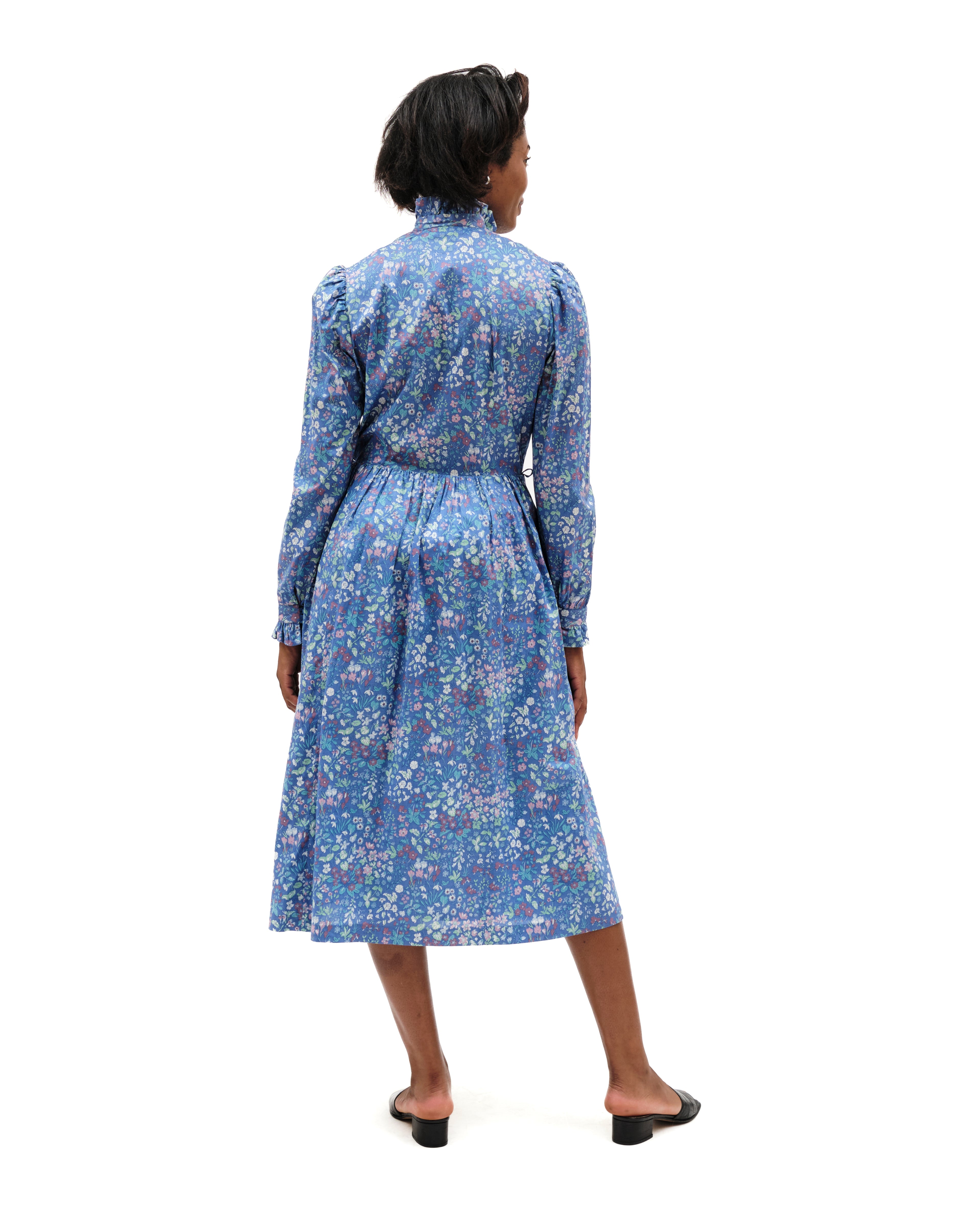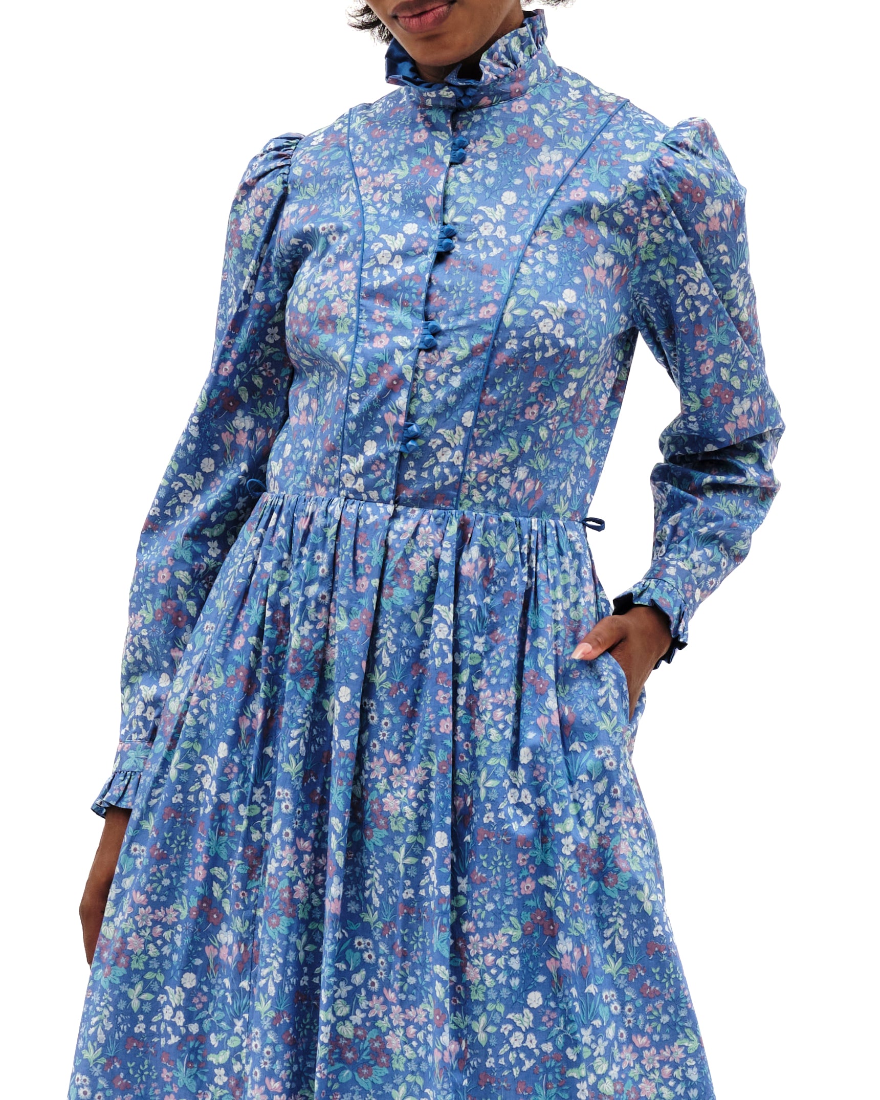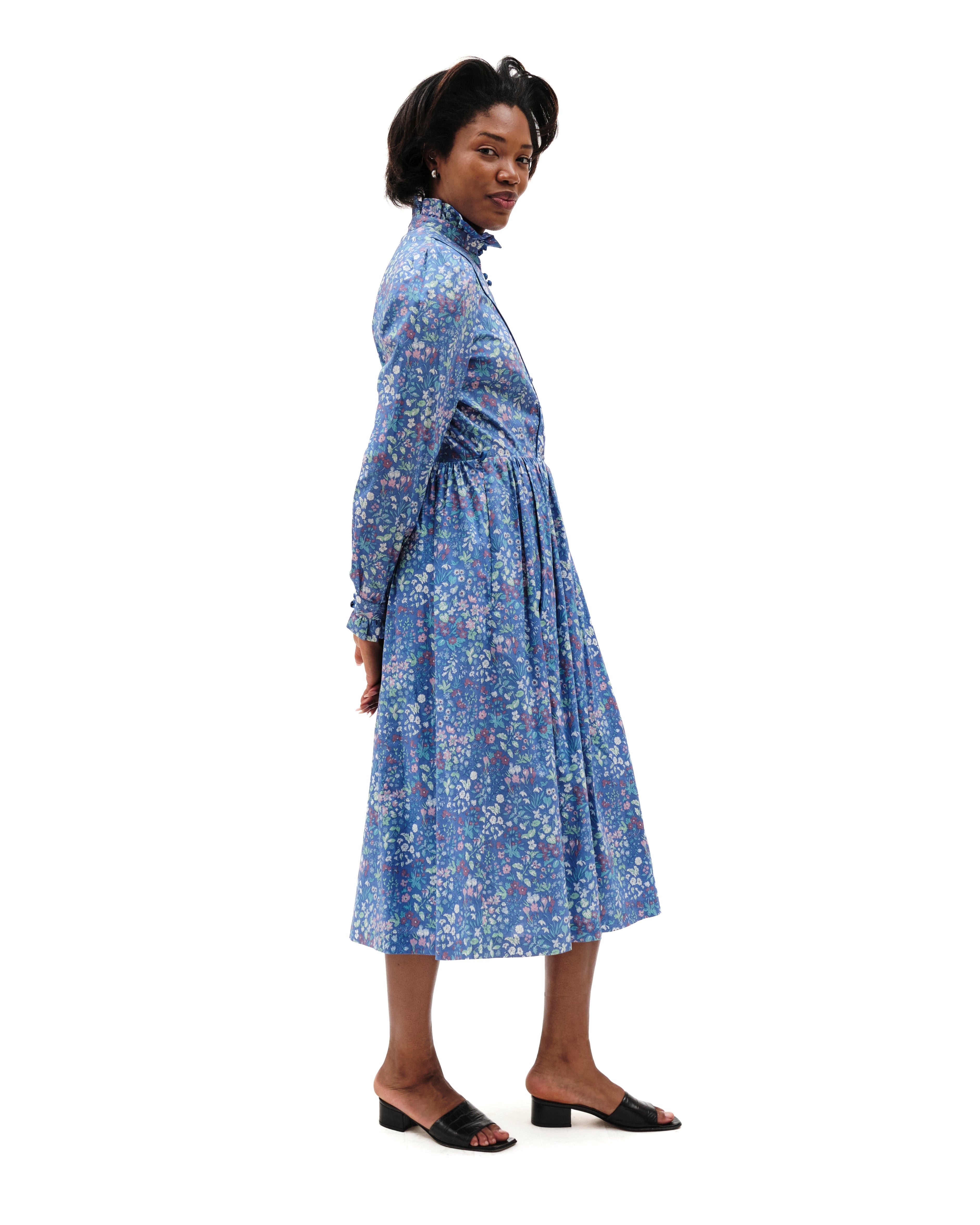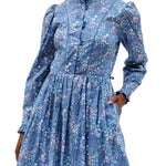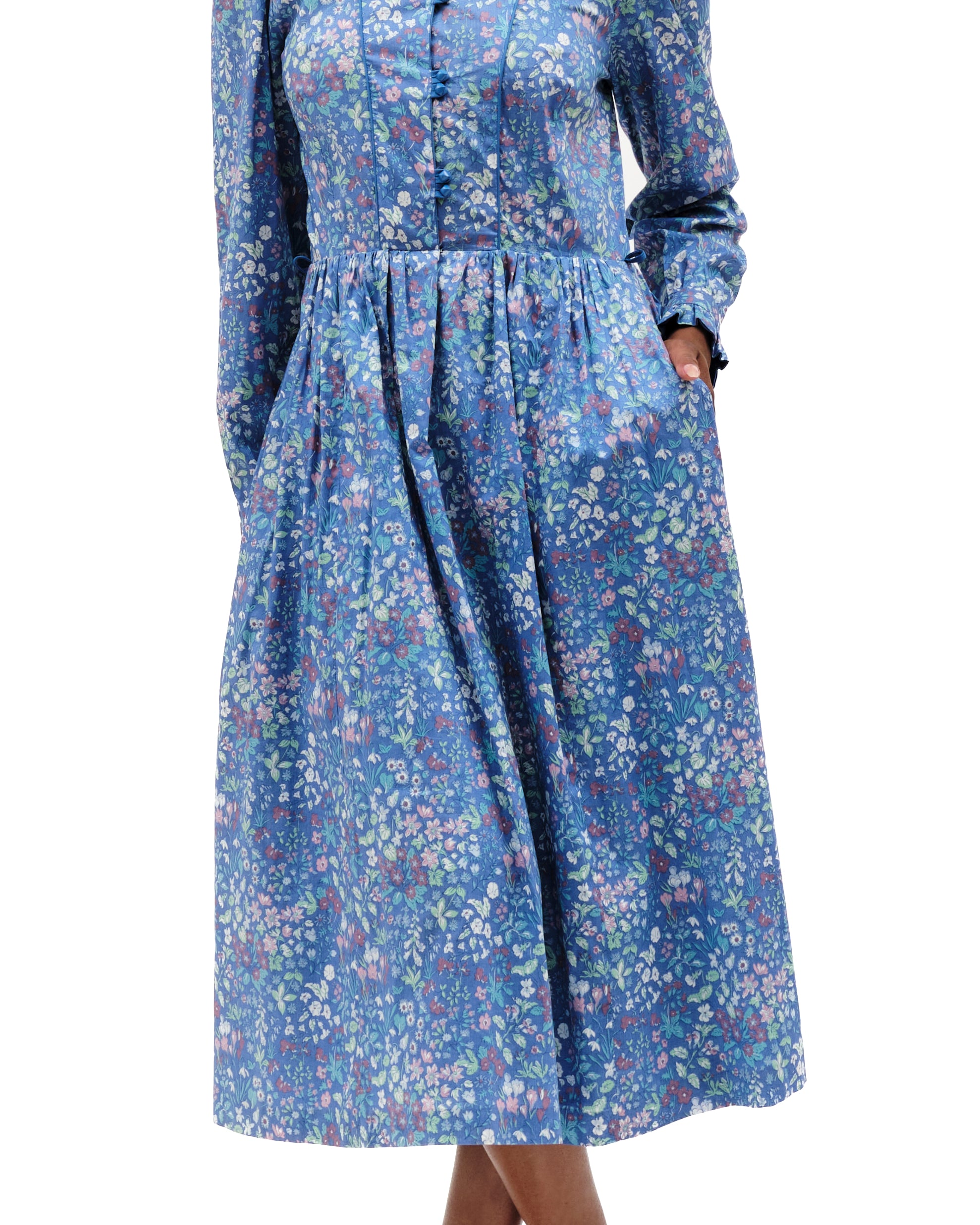 Vintage frock by Marion Donaldson. Periwinkle maxi floral dress, lovely lightweight cotton with playful pastel flowers. Ruffled stand-up collar with double button clusters to waistband. Curved blue piping from shoulders to waistline. Pouf sleeves- gathered shoulders- long sleeved, double buttoned cuffs with ruffled edges. Buttons are beveled shiny blue. Pleated waist, flared at hem. Skirt lined in light blue fabric, with hook and eye closure at waist. Mid-calf length, pockets, pockets, pockets. Missing belt, belt loops intact. Label reads “size 16, made in Scotland, fabric made in the UK.” Model is a size small.