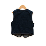 Vintage dark denim children's jean vest. Deep v neckline, curved sleeveless armholes. Triple bronze snap buttons embossed with "Mr.Leggs." Rust stitching, lengthwise from mid-shoulder to hem. Waist patch pockets, pointed vest hemline. Label reads "Medium. Machine wash." Probably 100% cotton.