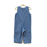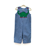 Vintage homemade onesie. Medium blue with red buttons at shoulders. Sleeveless. Appliqué green, red, navy blue dinosaur on chest. Yellow eyes, hehe. Pant legs, several scuffs on right leg. Label reads "Made with Love for Number One."