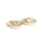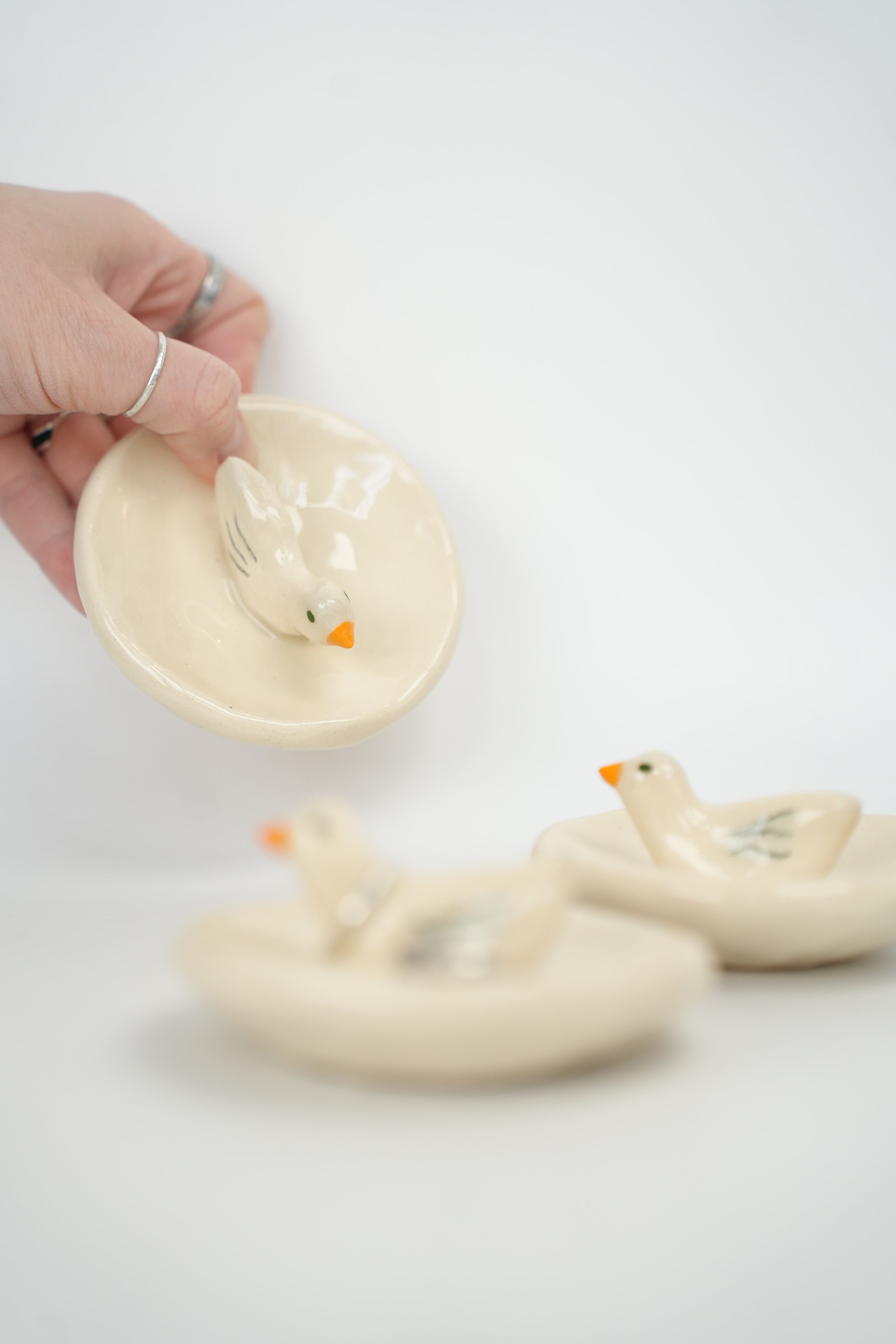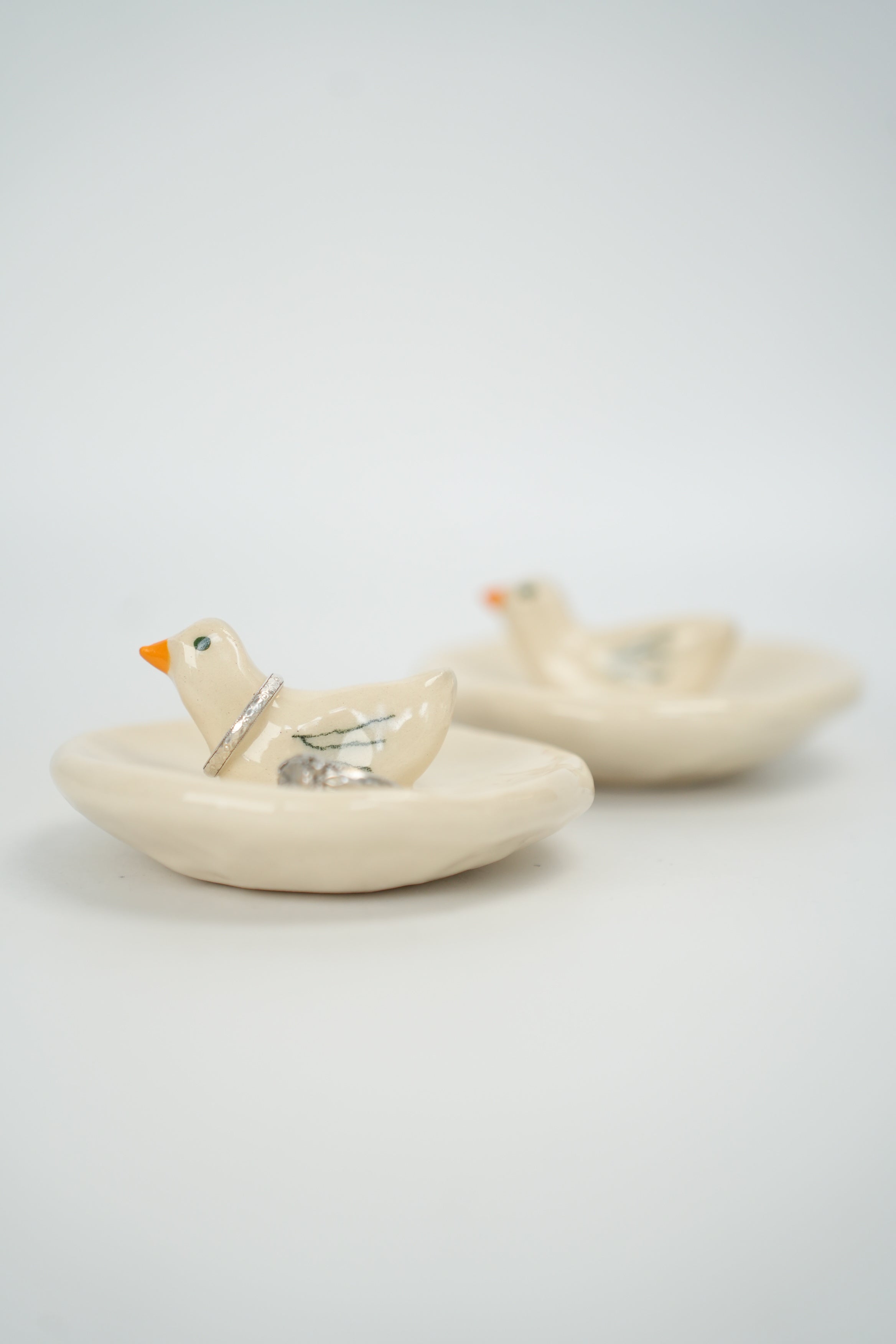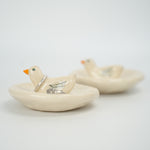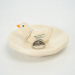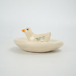 Small cream hand built bowl with small duck in the middle. Tiny yellow beak, black dot eye, three stripes for wings. Positively charmant. Bottom stamped “Toni Darling Frank.”