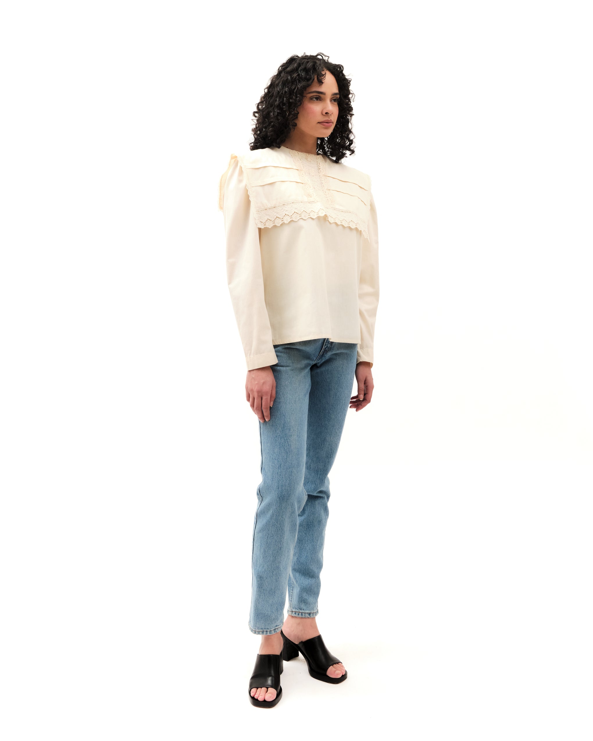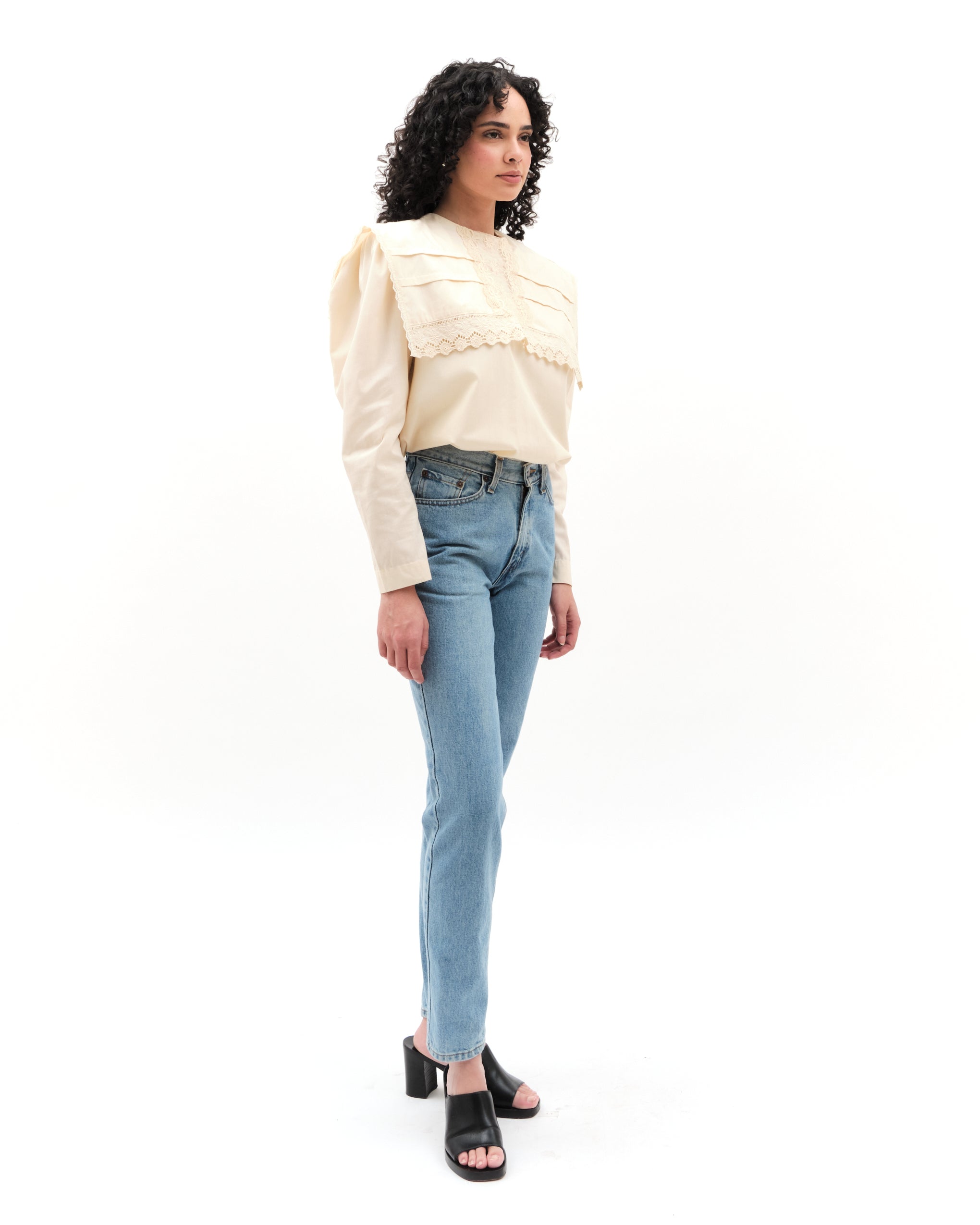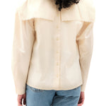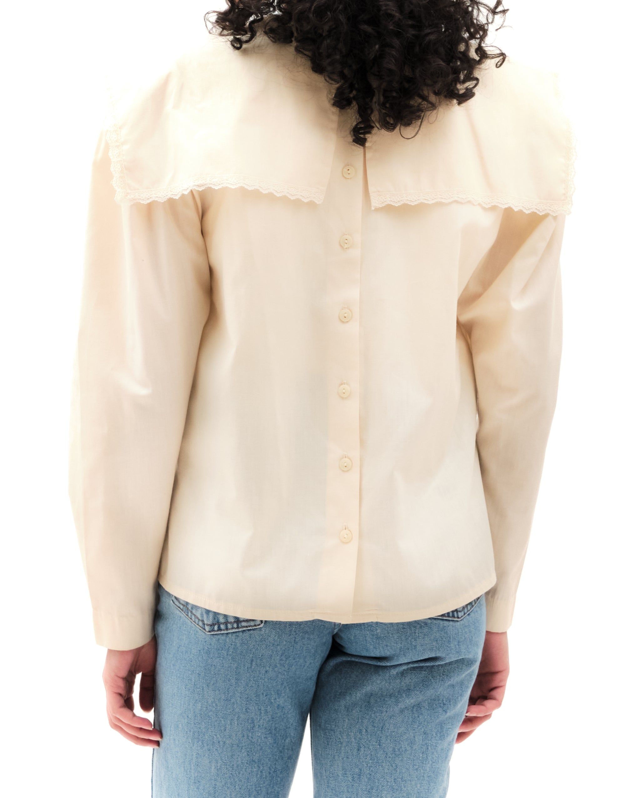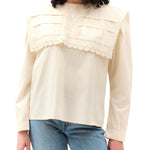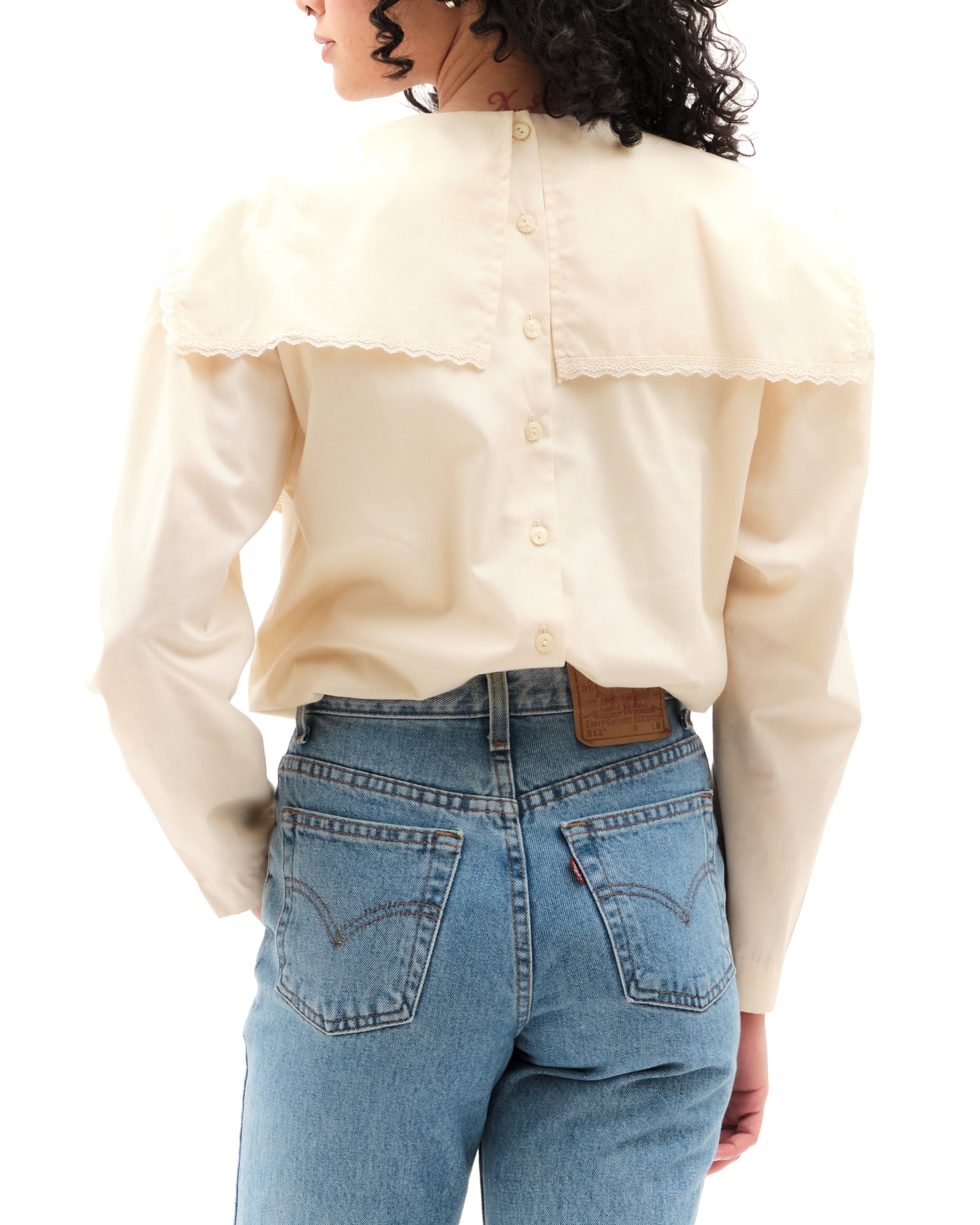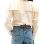 Vintage Gunne Sax blouse. Soft cream cotton, the true star here is the front **and** back square sailor collar. Sheer lace central panel, and lovely lace trim. Double horizontal tiers on collar. Collar is slit at back for access to lengthwise buttoned opening.