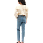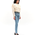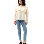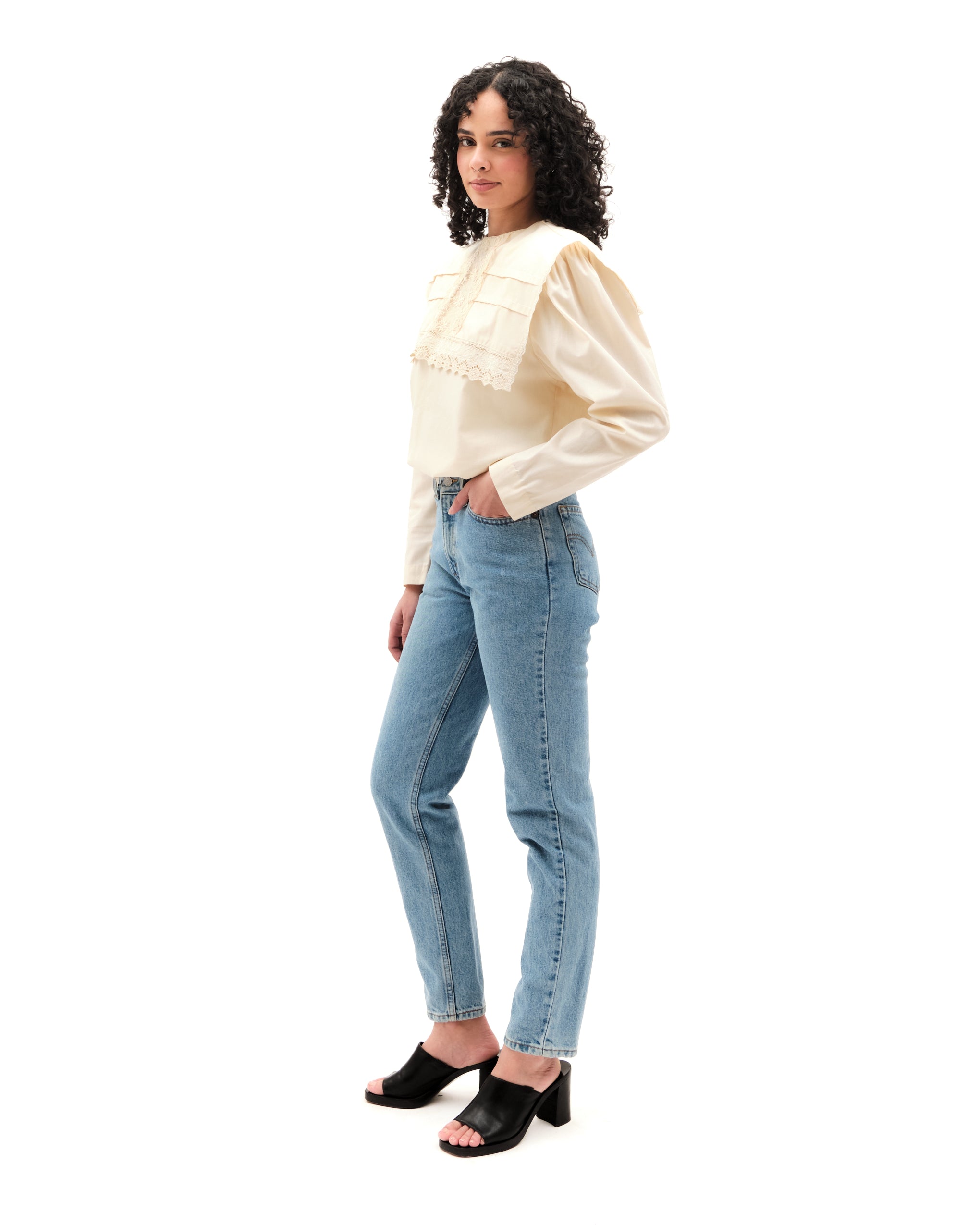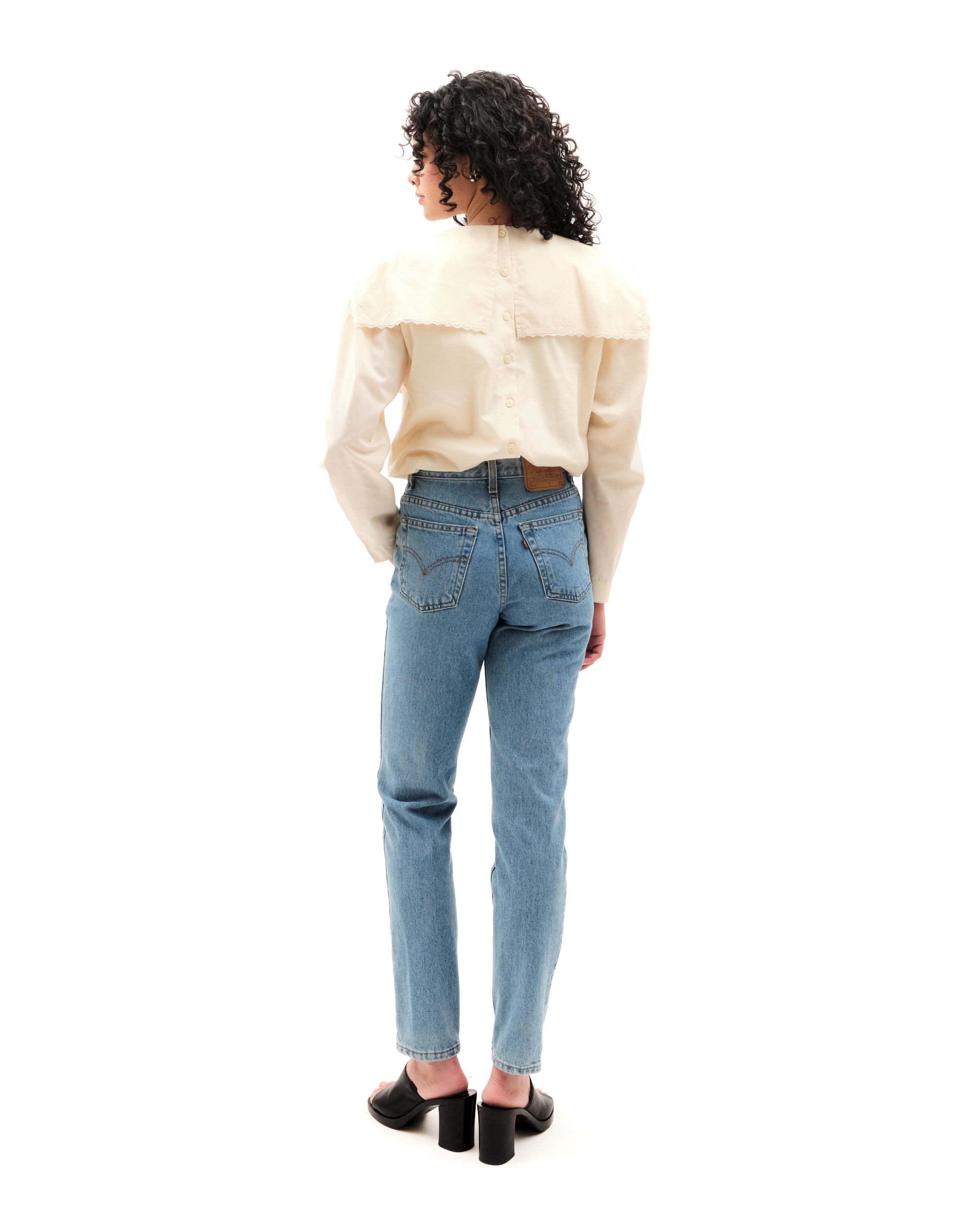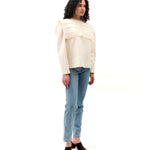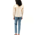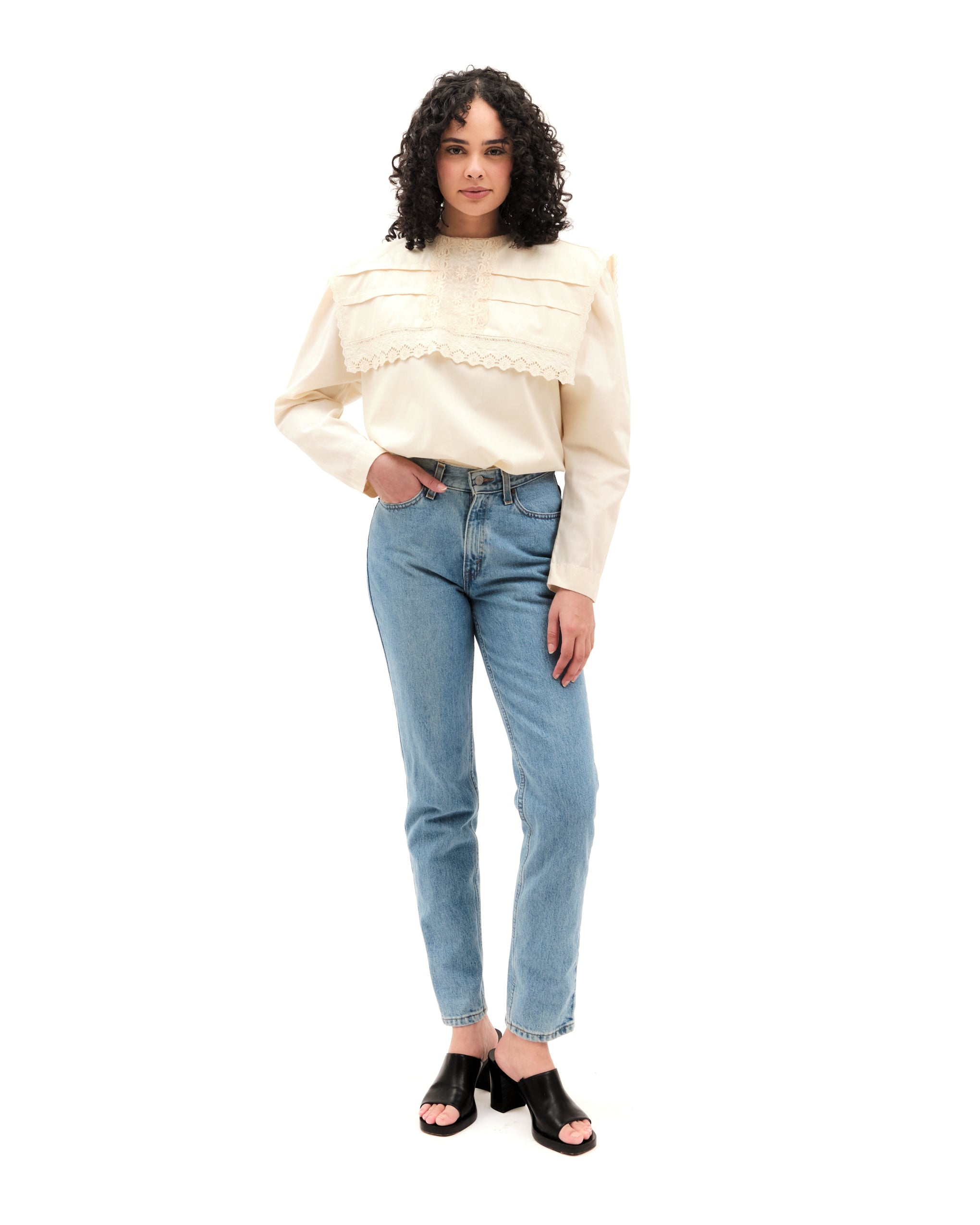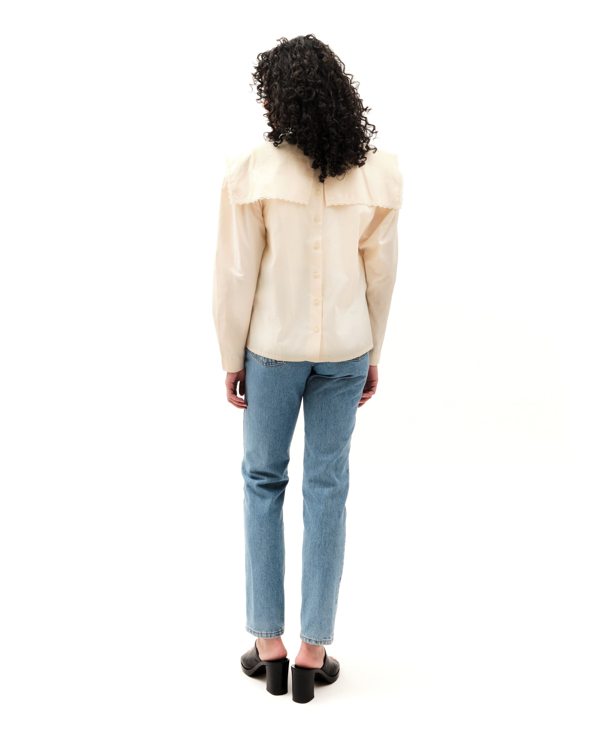Vintage Gunne Sax blouse. Soft cream cotton, the true star here is the front **and** back square sailor collar. Sheer lace central panel, and lovely lace trim. Double horizontal tiers on collar. Collar is slit at back for access to lengthwise buttoned opening.
