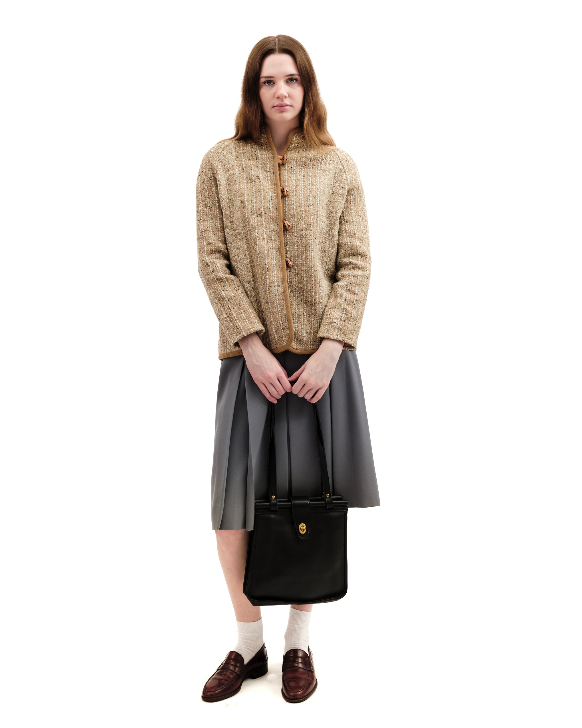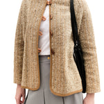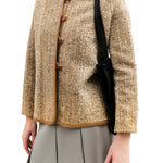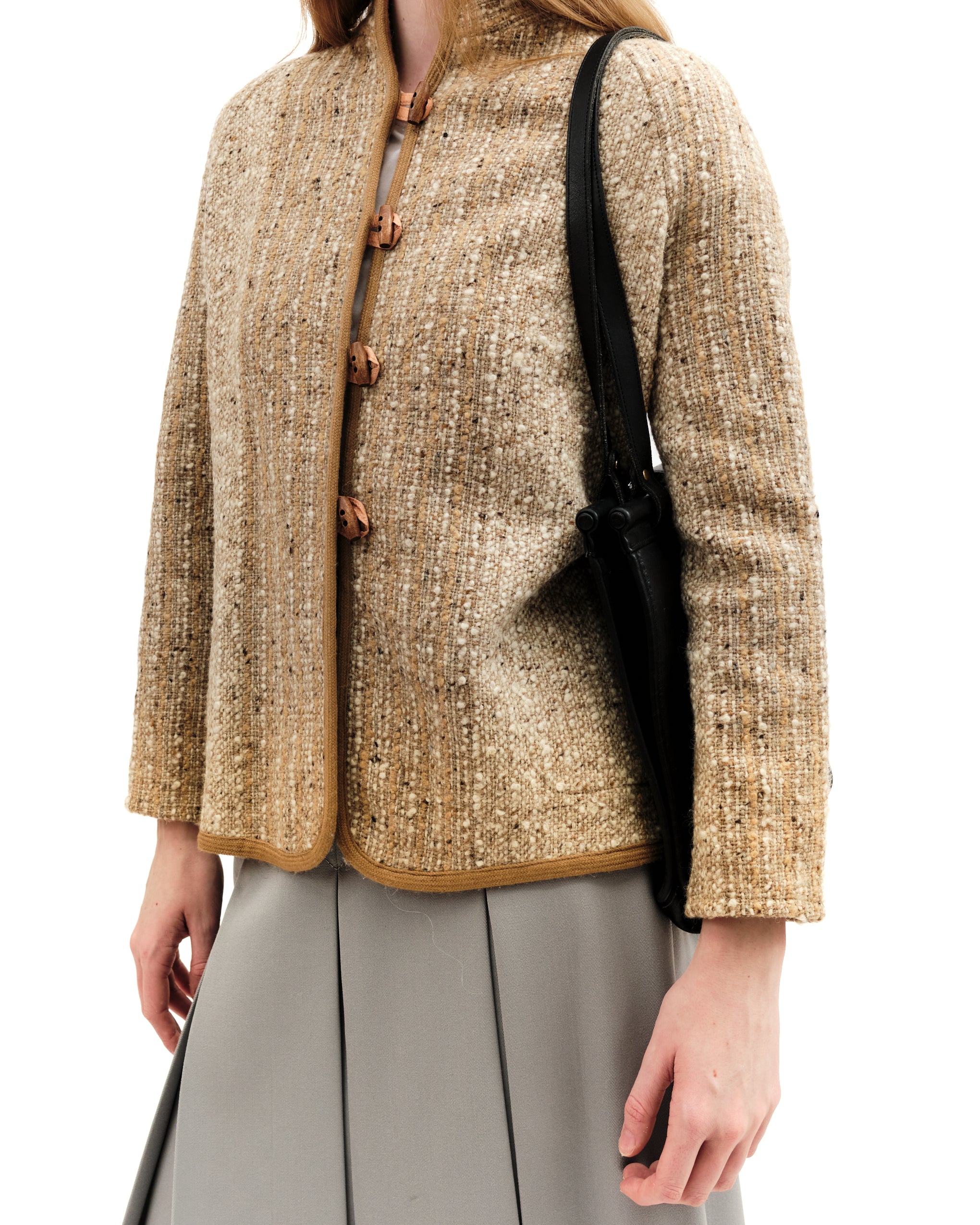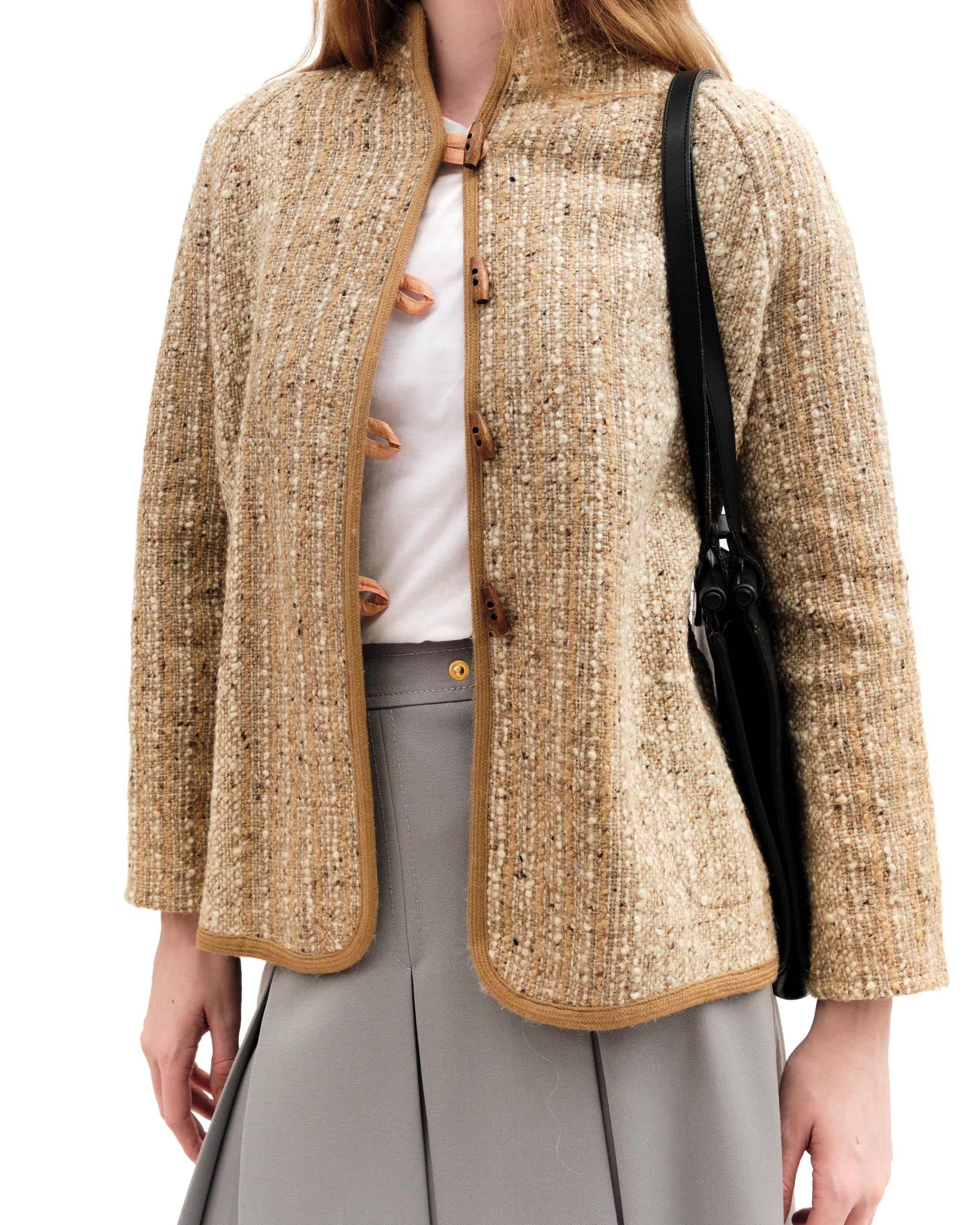 Flecked woven wool of cream, ochre, dark brown, and tan. Tan braided piping borders. Stand-up collar with curved opening, hip length. Slit pockets at waist. Raglan sleeves . Unlined. Wood toggle buttons with peach fabric buttonhole loops. Label reads "Studio Donegal. Handcrafted and handwoven. A product of Donegal Weavers. Dry clean only. Size 10.” Model is an xs.
