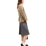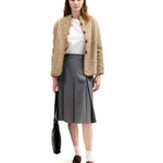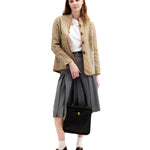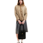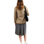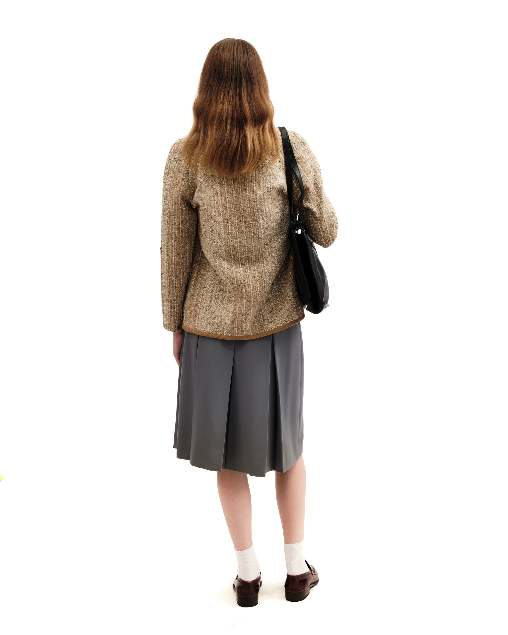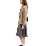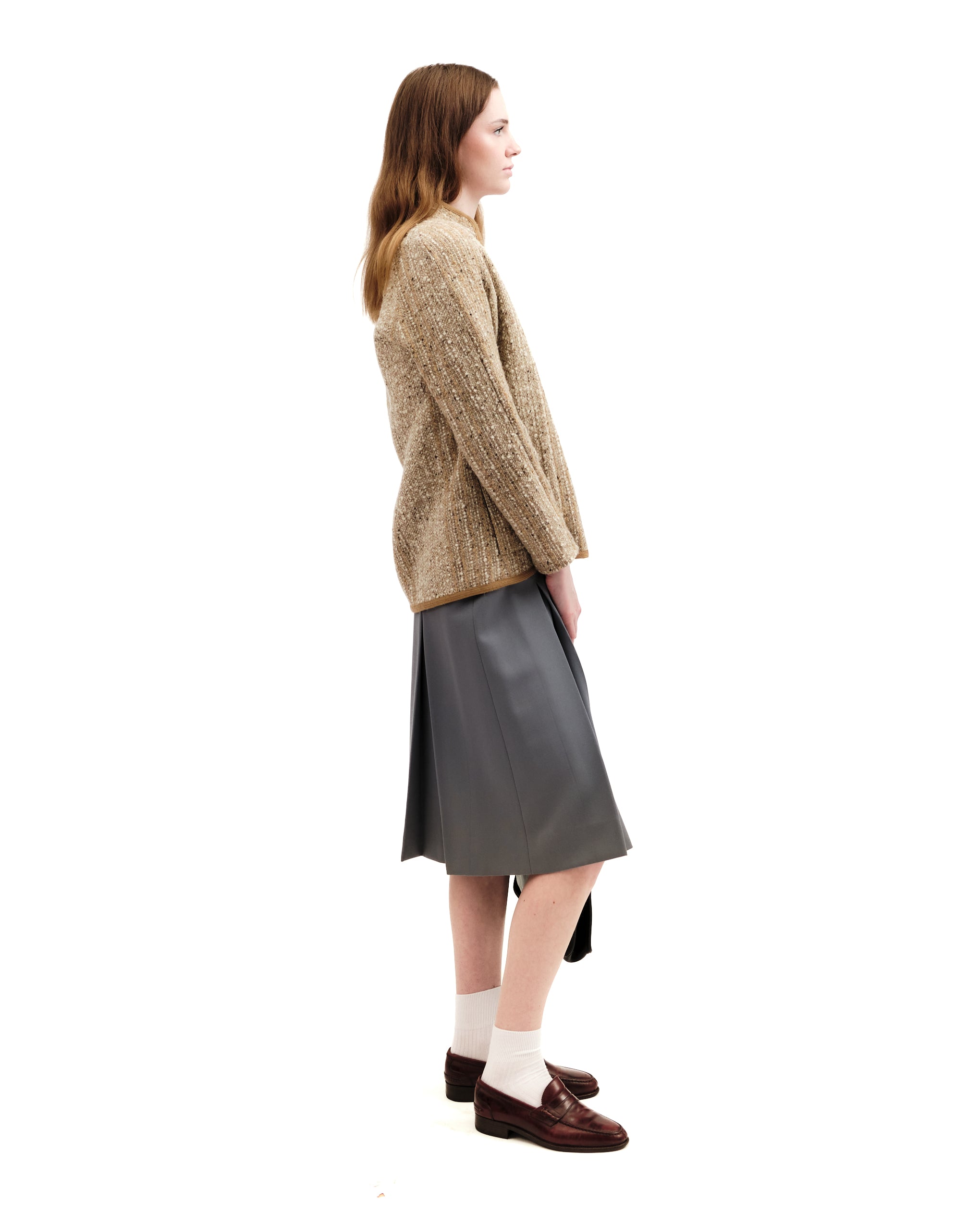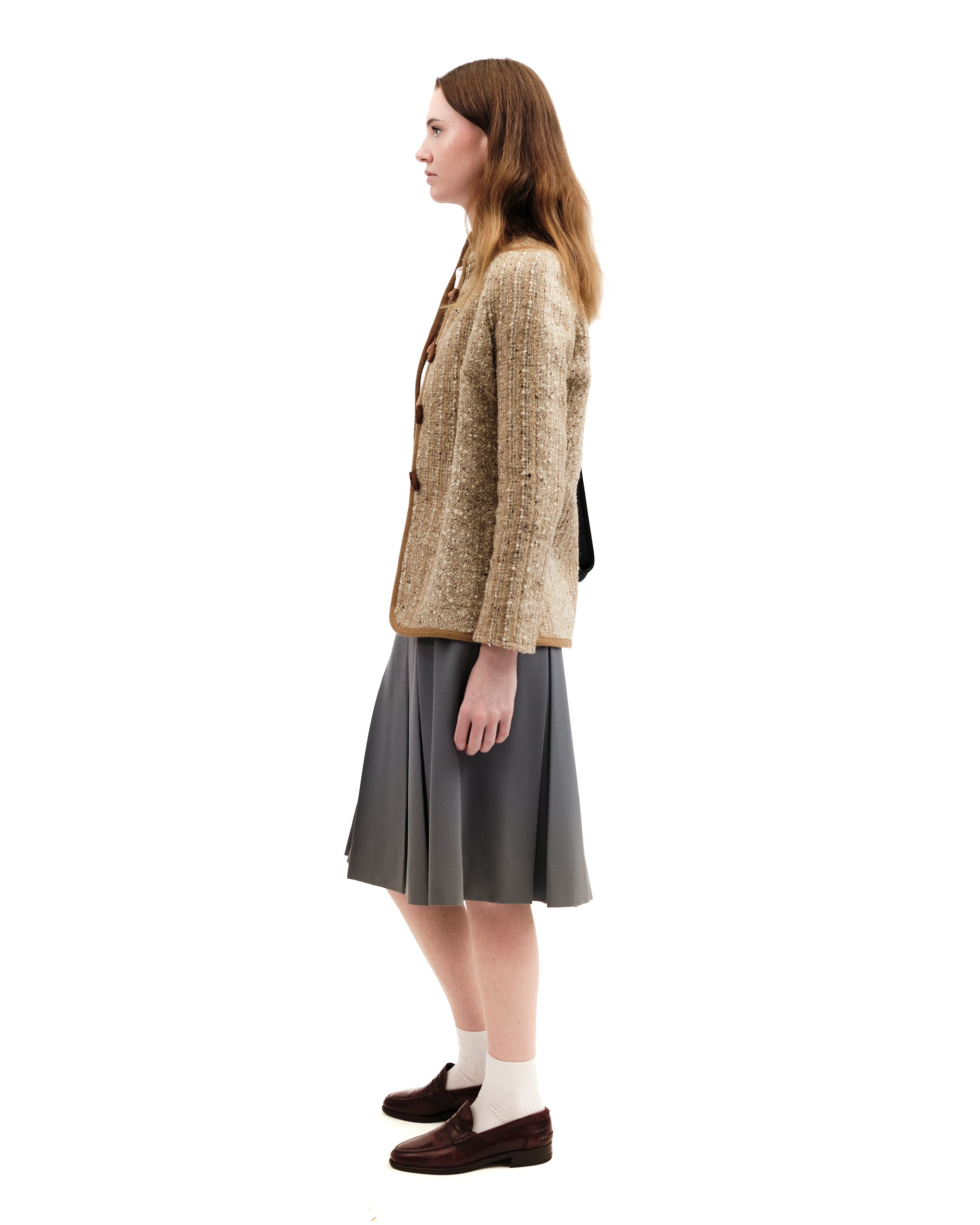Flecked woven wool of cream, ochre, dark brown, and tan. Tan braided piping borders. Stand-up collar with curved opening, hip length. Slit pockets at waist. Raglan sleeves . Unlined. Wood toggle buttons with peach fabric buttonhole loops. Label reads "Studio Donegal. Handcrafted and handwoven. A product of Donegal Weavers. Dry clean only. Size 10.” Model is an xs.