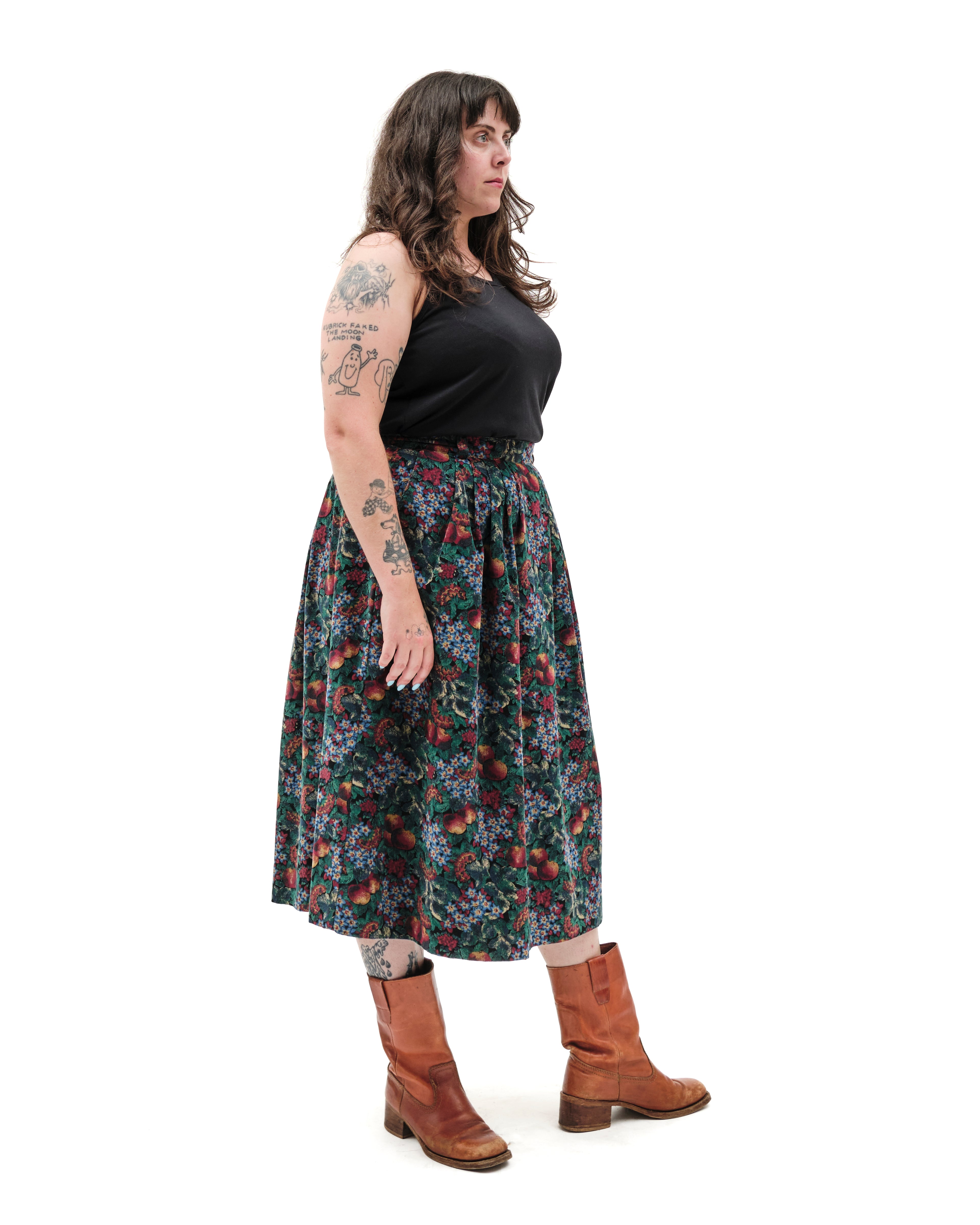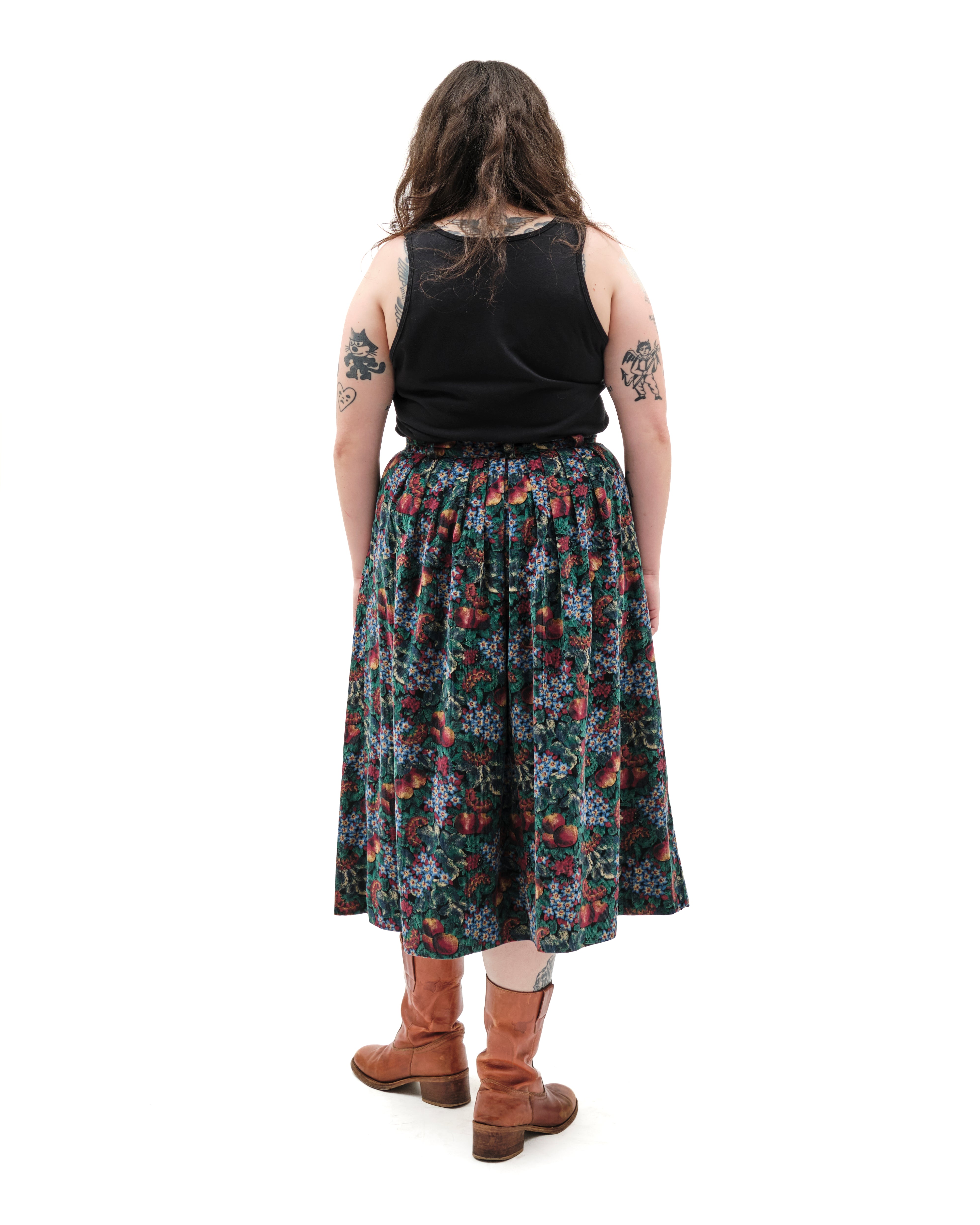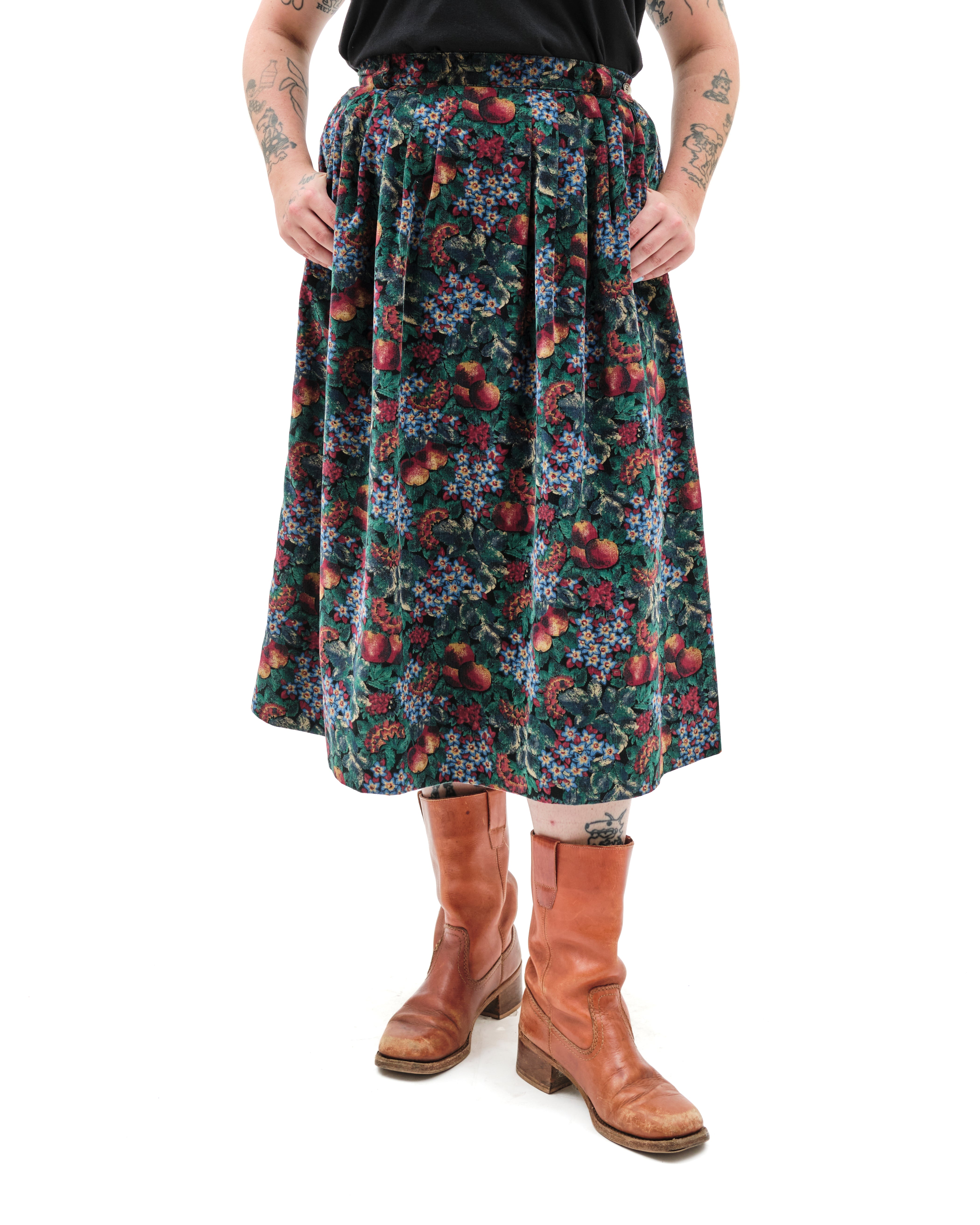 Vintaggio LL Bean corduroy skirt with fruits and fleurs in deep jewel tones, yes~