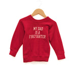 Vintage red sweatshirt. Ribbed neckline, cuffs and hem. Raglan sleeves. On front, in white, is printed "My Dad is a Firefighter." Gah. label reads "Champion, xs 2-4, machine wash." Small white mark on right side of hem, as is! We actually have two of these. The unlisted second is in slightly worse condition. Please inquire if interested <3