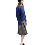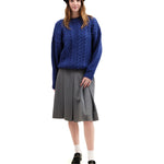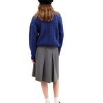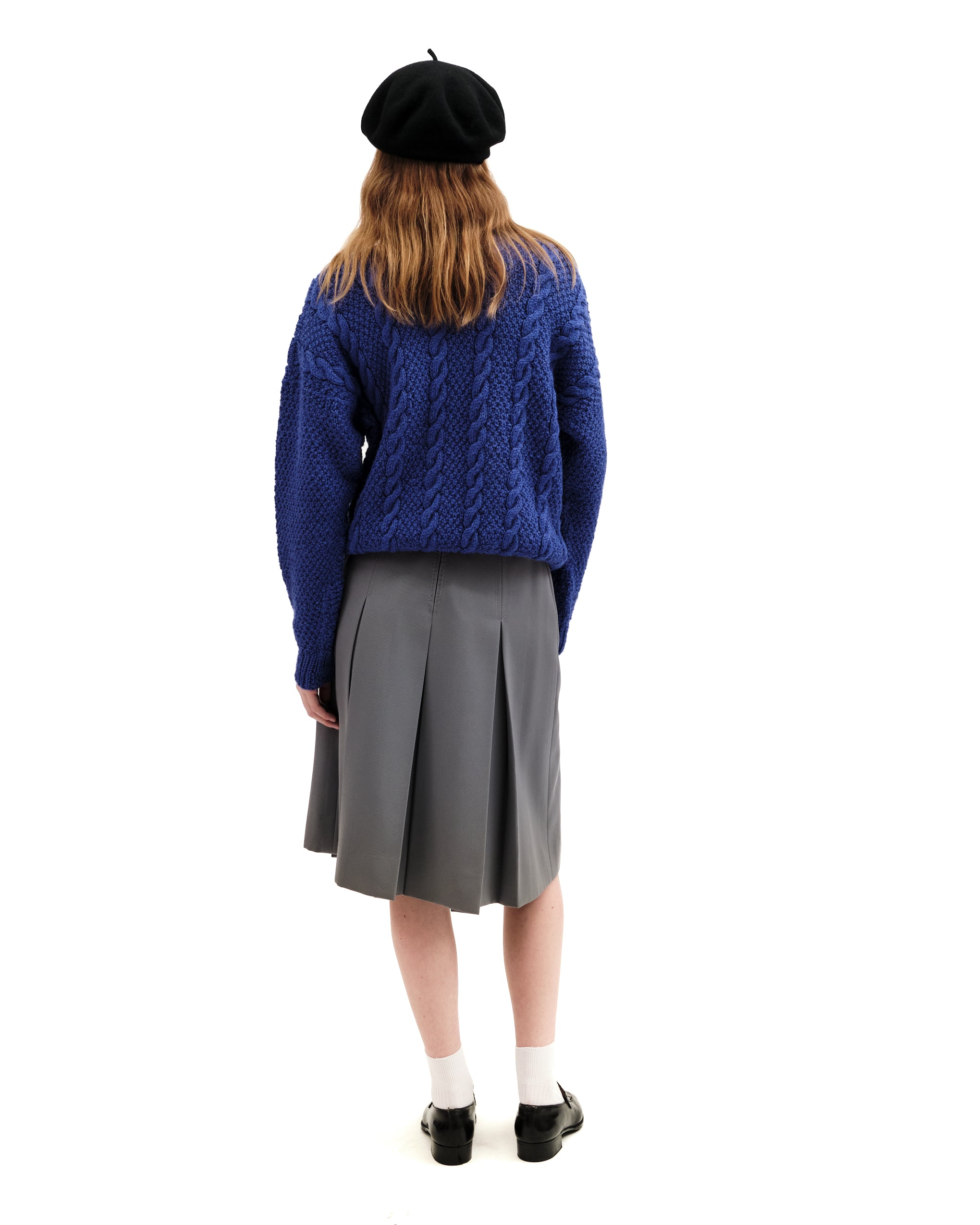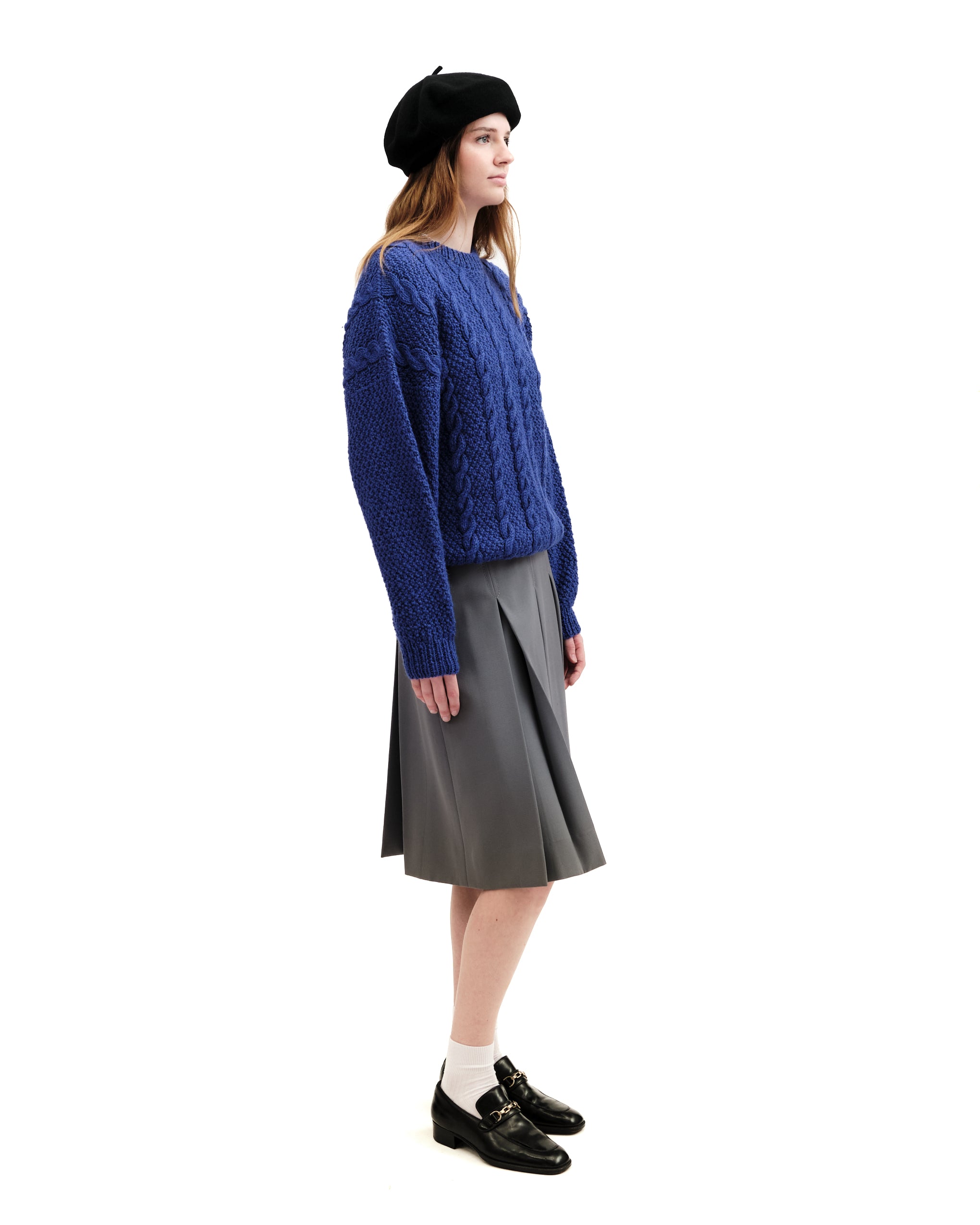 Ribbed neck, cuffs and hem, with lengthwise braided knit and "dotted" knit. Dropped sleeves. No label, but this is an Aran knit I believe, and 100% wool. Just lovely!