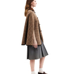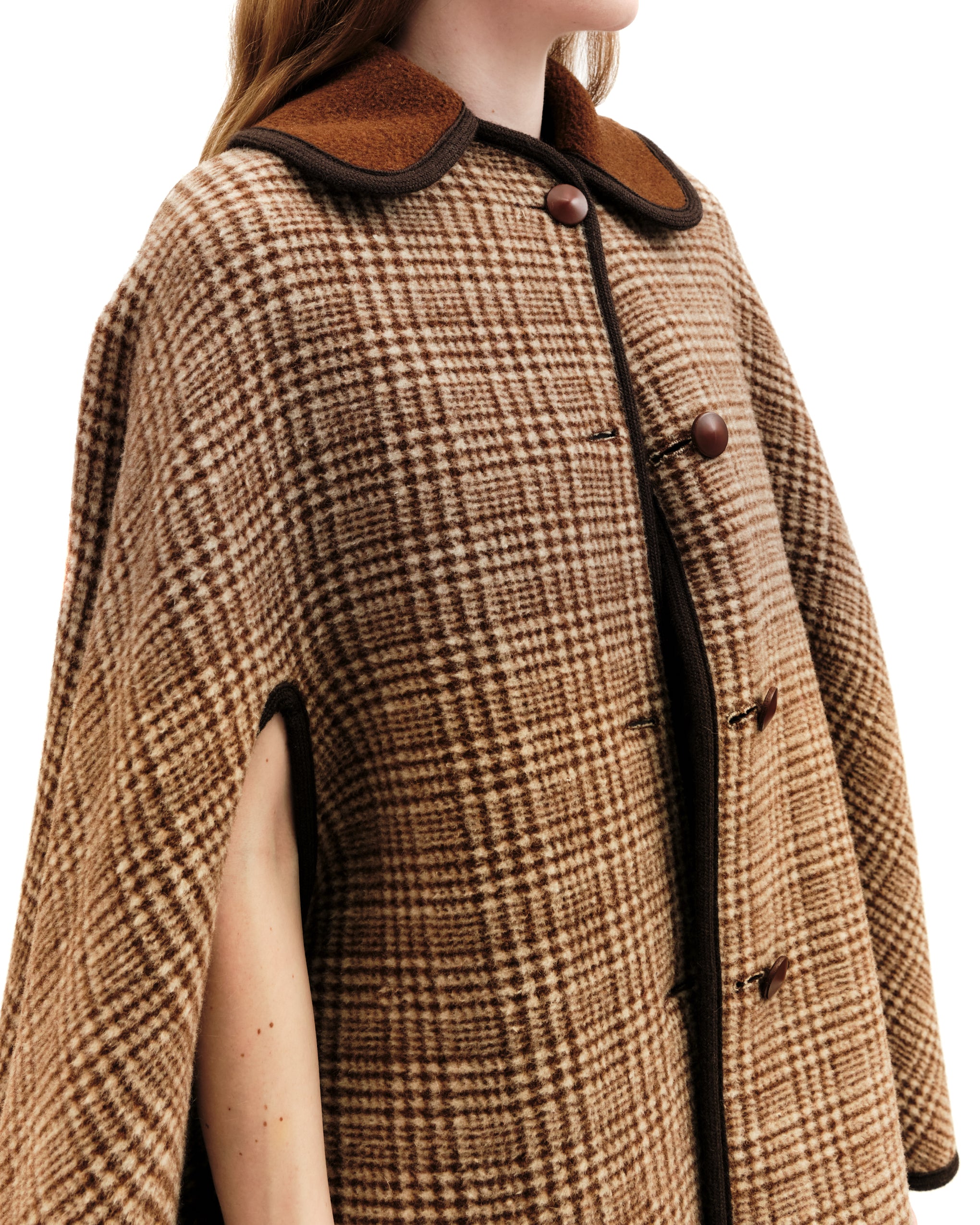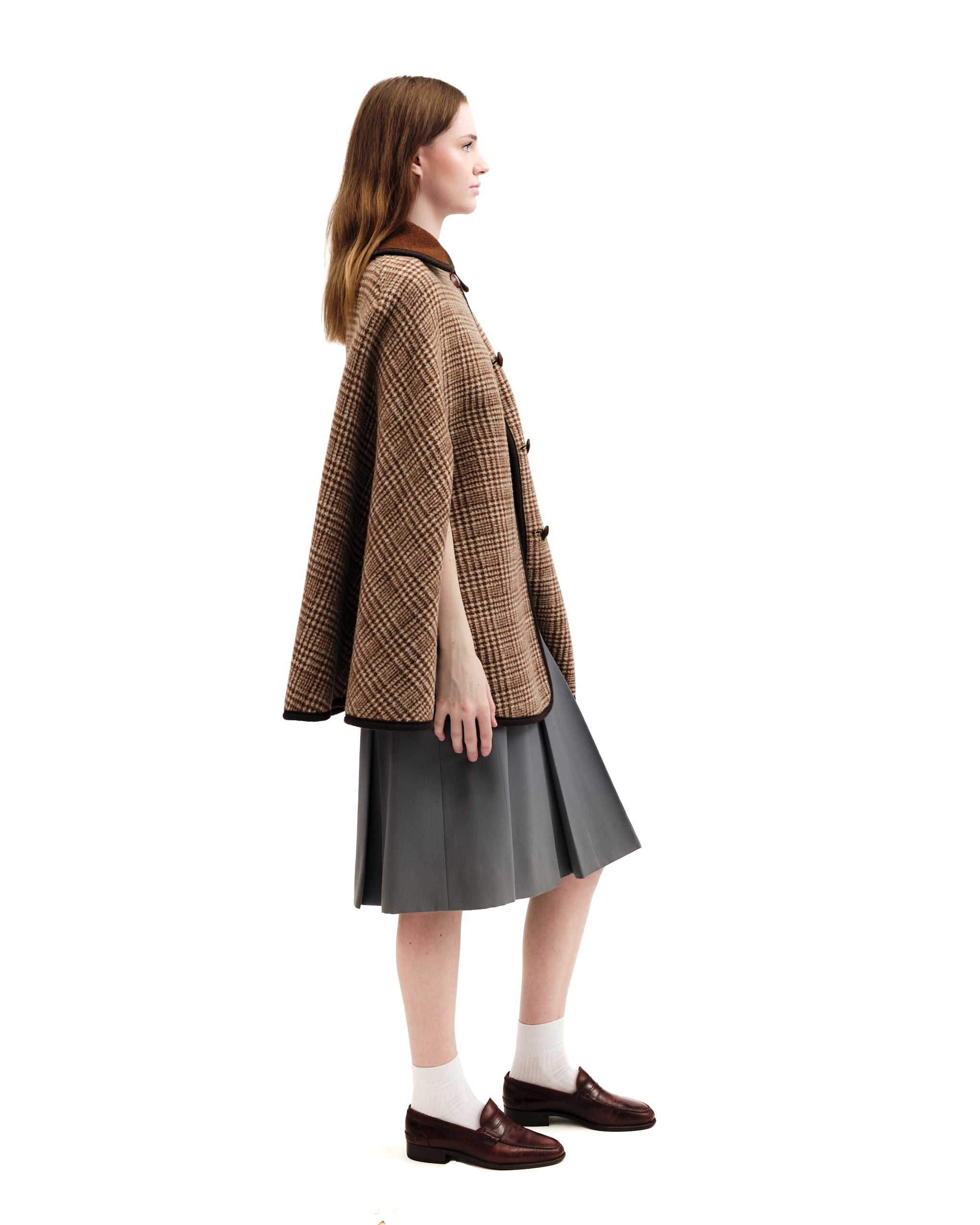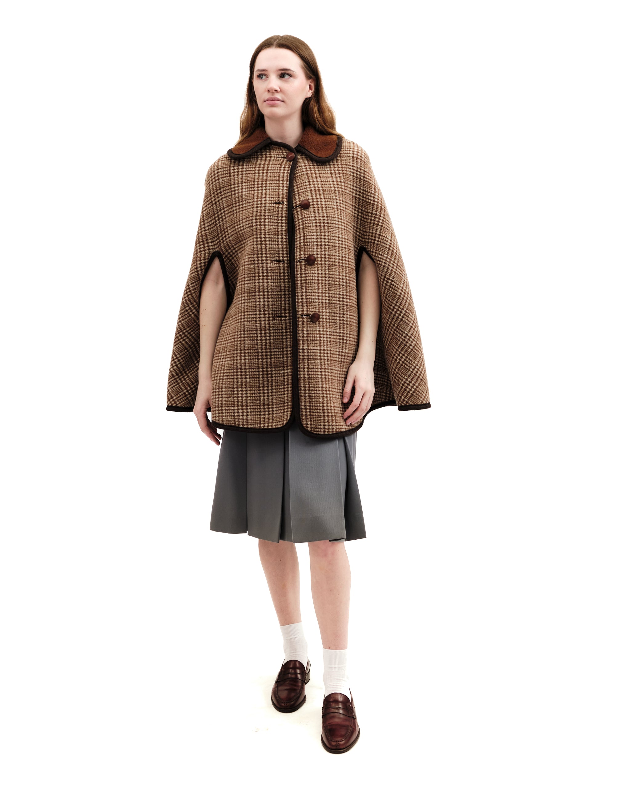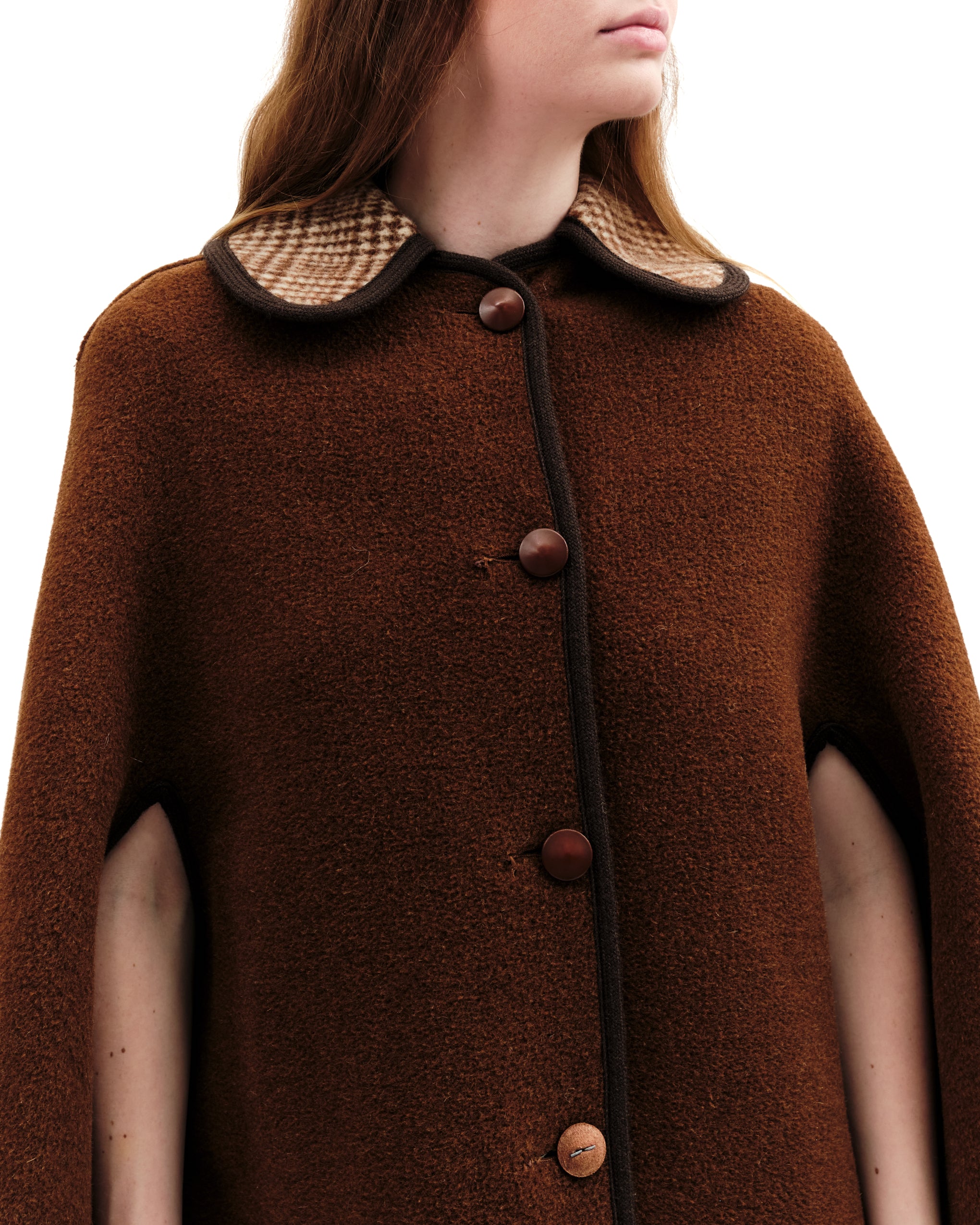 One side is a deep rust brown hue with braided, chocolate brown piping at edges. Brown and cream plaid collar. The other side, brown and white plaid body with leather covered buttons and rust collar. Curved triangular insert at shoulders on both sides. Lengthwise leather covered buttons- slits next to buttons for magical reversibility! Last button on brown side is missing leather topper! As is. Mid-body armhole slits. Attached hang tag which can be tucked out or in (covered in both fabrics) with brand name, fabric content. Model is an xs.