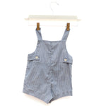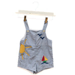 Homemade sailing themed onesie. Overall straps, square neck, white buttons at straps. Buttoned straps at back waist. Lined in white cotton. Blue and white pinstriped fabric with sun, sailboat, and seagulls appliqués. No label.