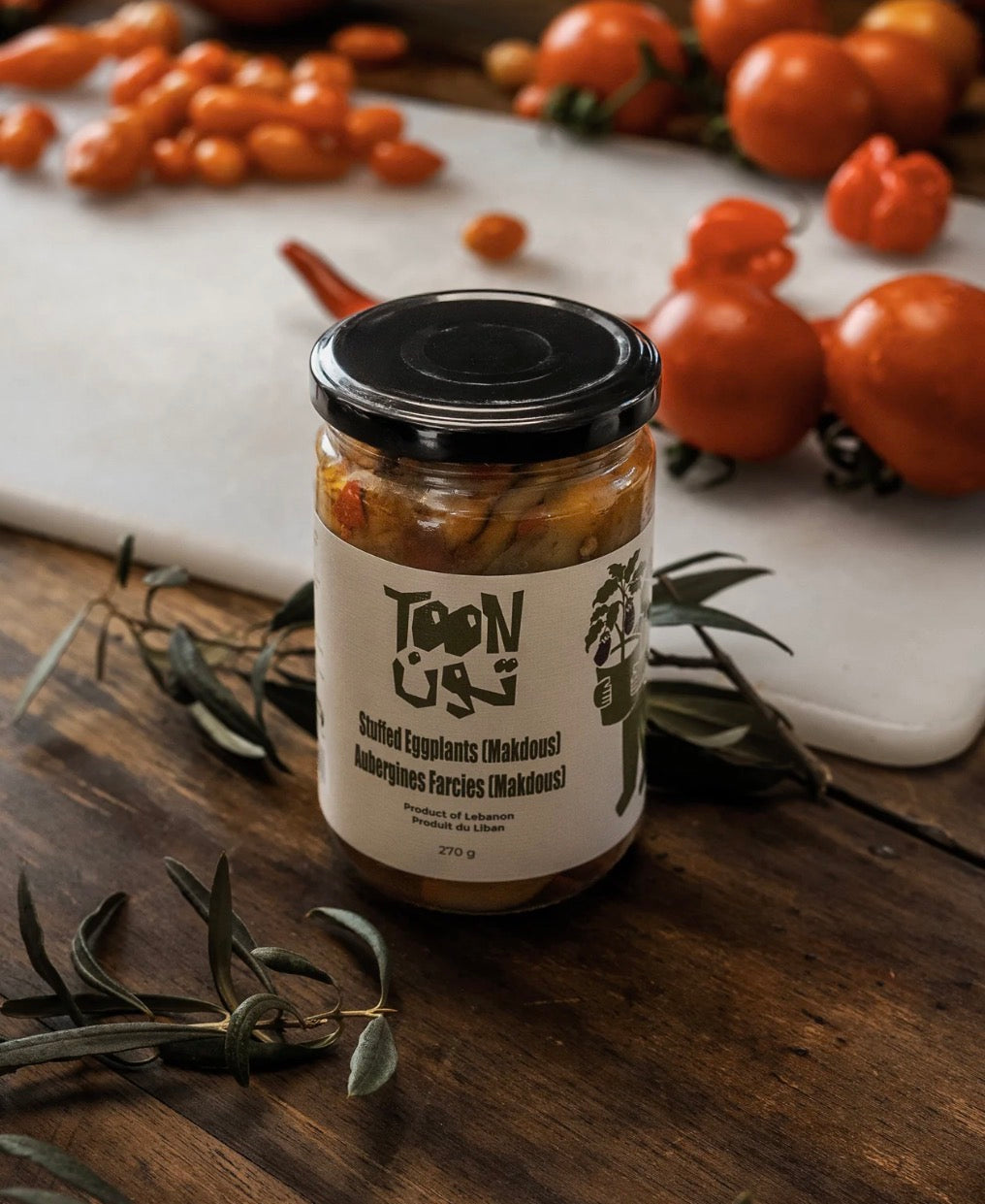 "Makdous is a traditional Levantine delicacy made just as it’s always been—by hand, in small batches, with love (and a lot of garlic). Our eggplants are grown in the sun-drenched soil of Qaa, a rural village nestled at the foot of the Anti-Lebanon mountains. Handpicked, each eggplant is carefully stuffed with a flavorful mix of walnuts, garlic, and sweet pepper before being preserved in olive oil.