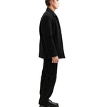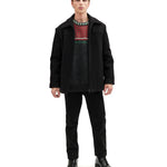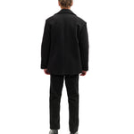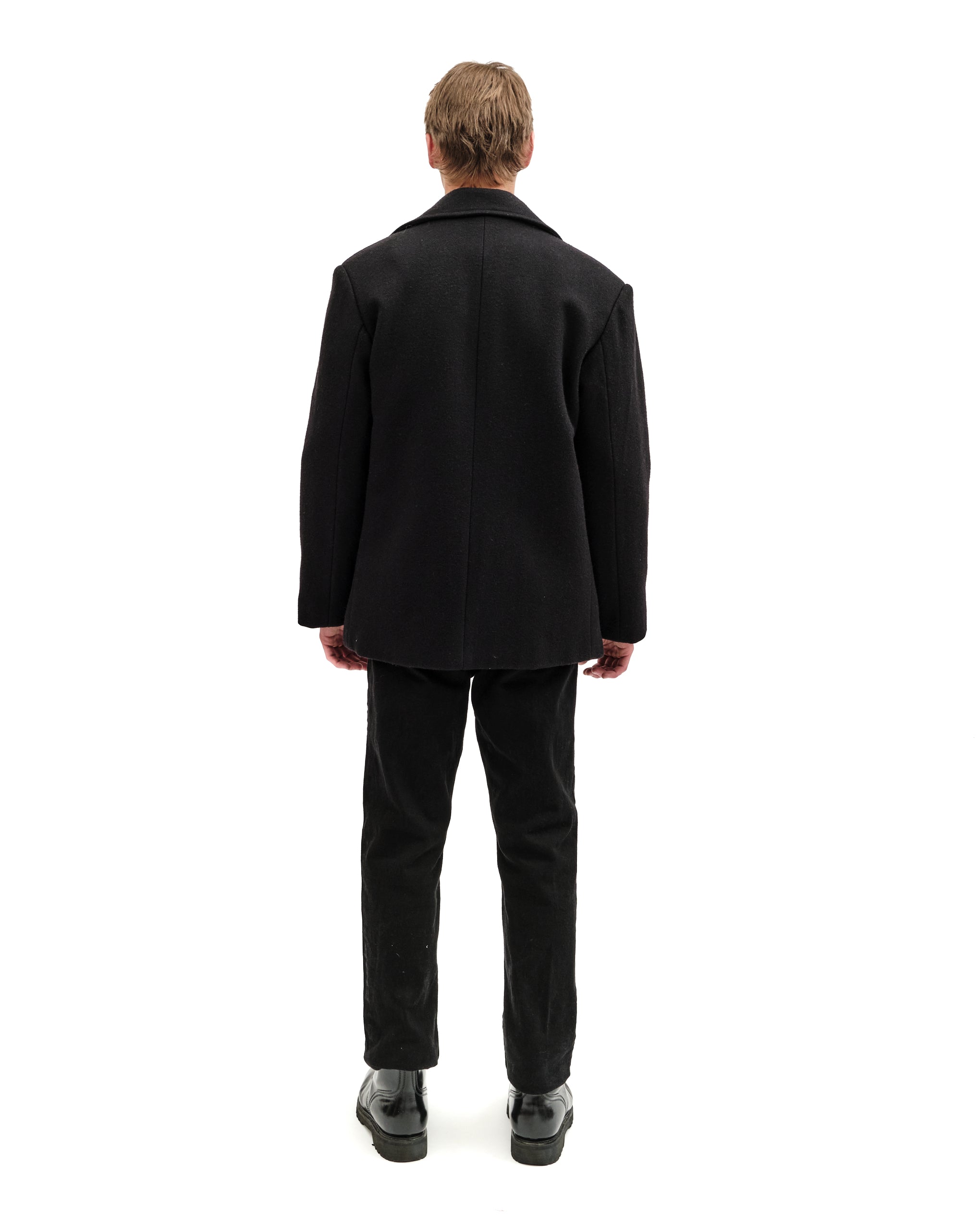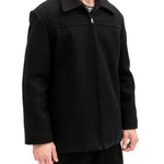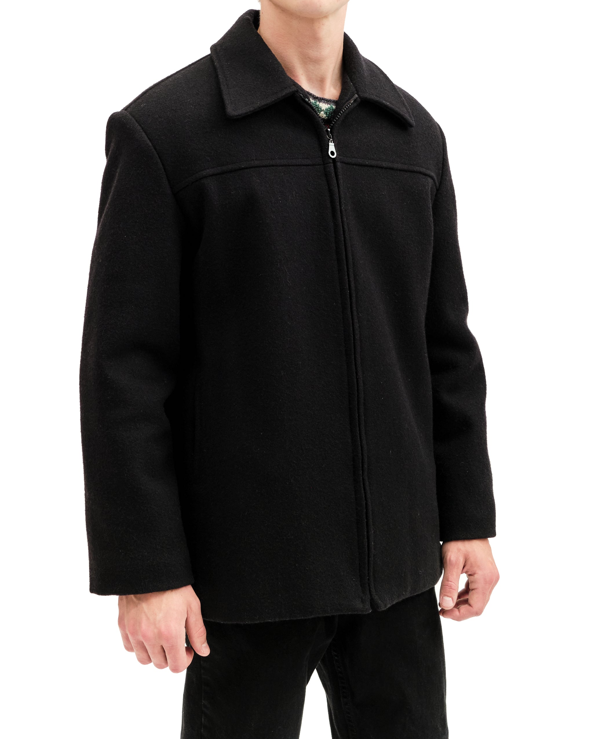 Vintage black wool coat. Collared, chest yoke. Lengthwise black zipper. Vertical slit pockets at waist. Lengthwise seams from underarms to hem. Waist length. Some padding at shoulders. Black satiny lining. Label reads "Made in Canada." Content label is quite rubbed off, but I can make out it is a blend of wool and nylon, and the lining is acetate. Size small.
