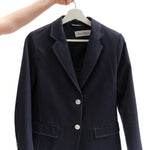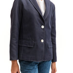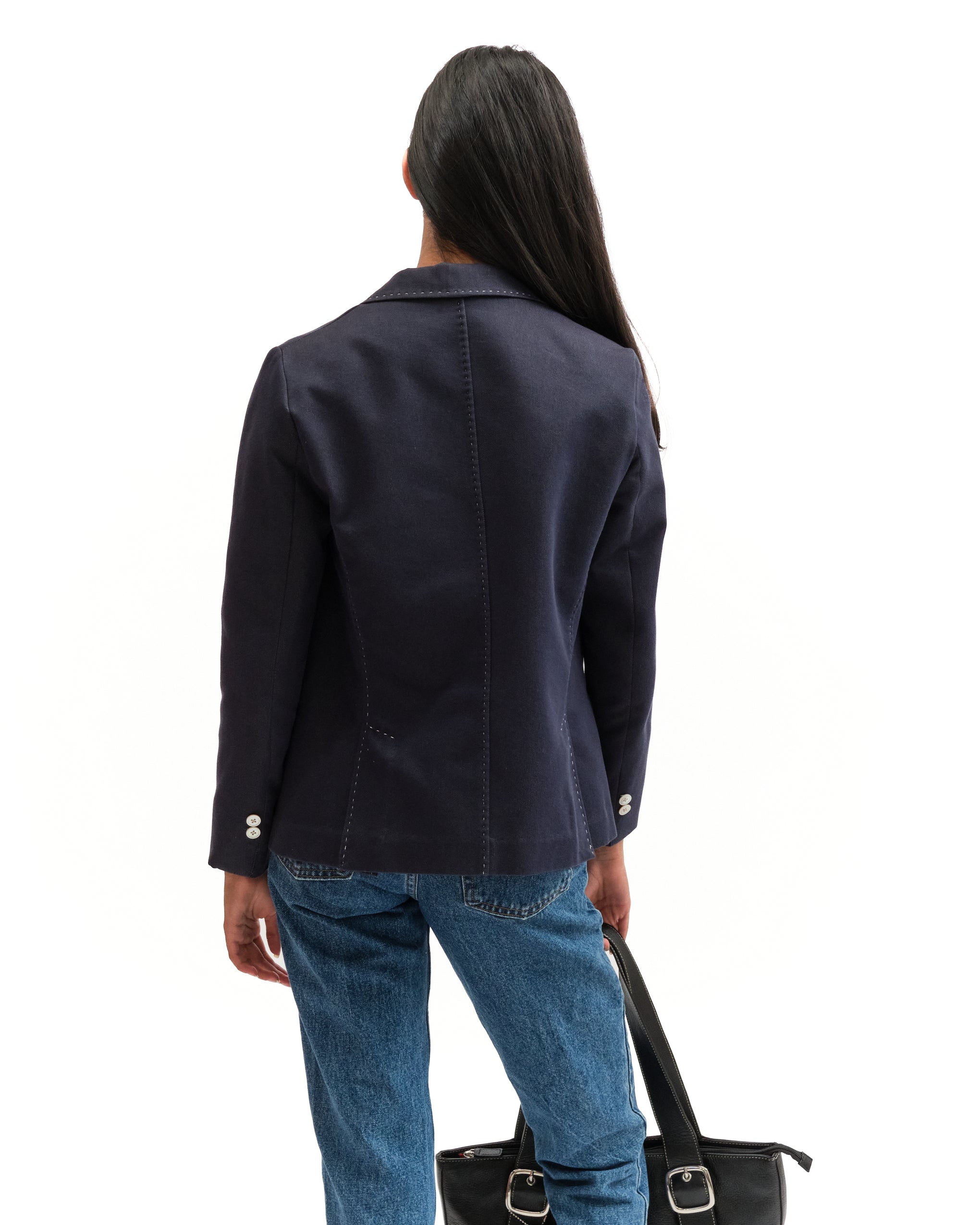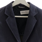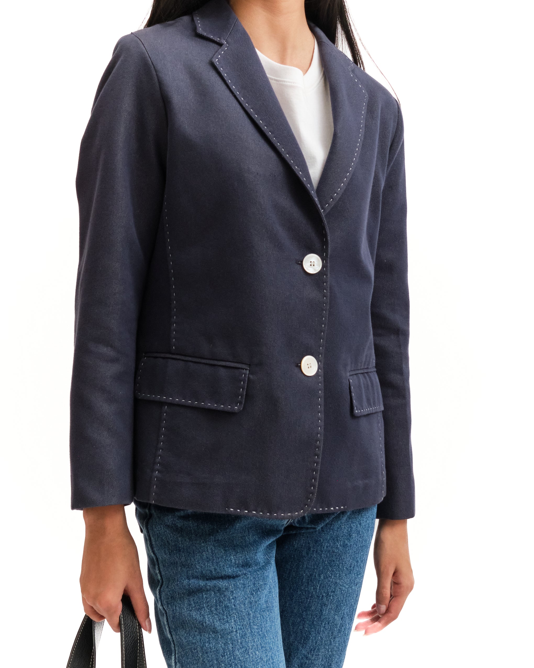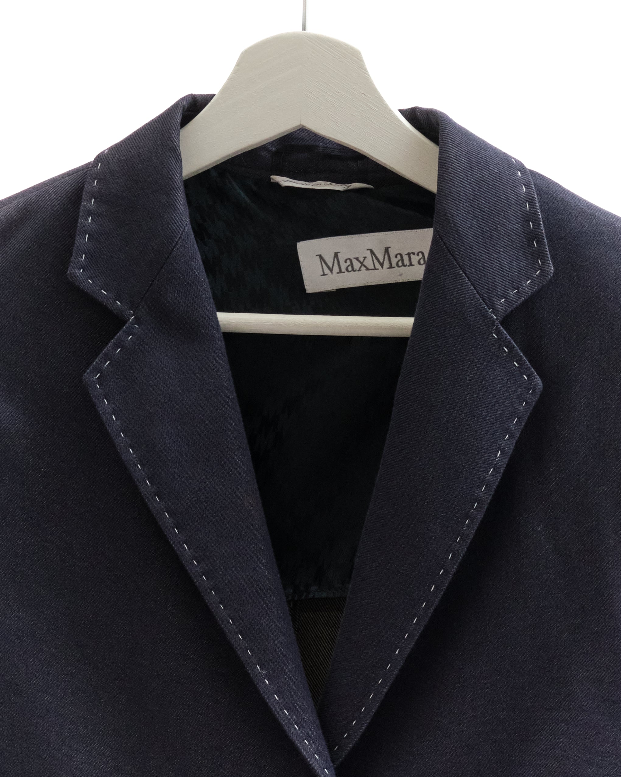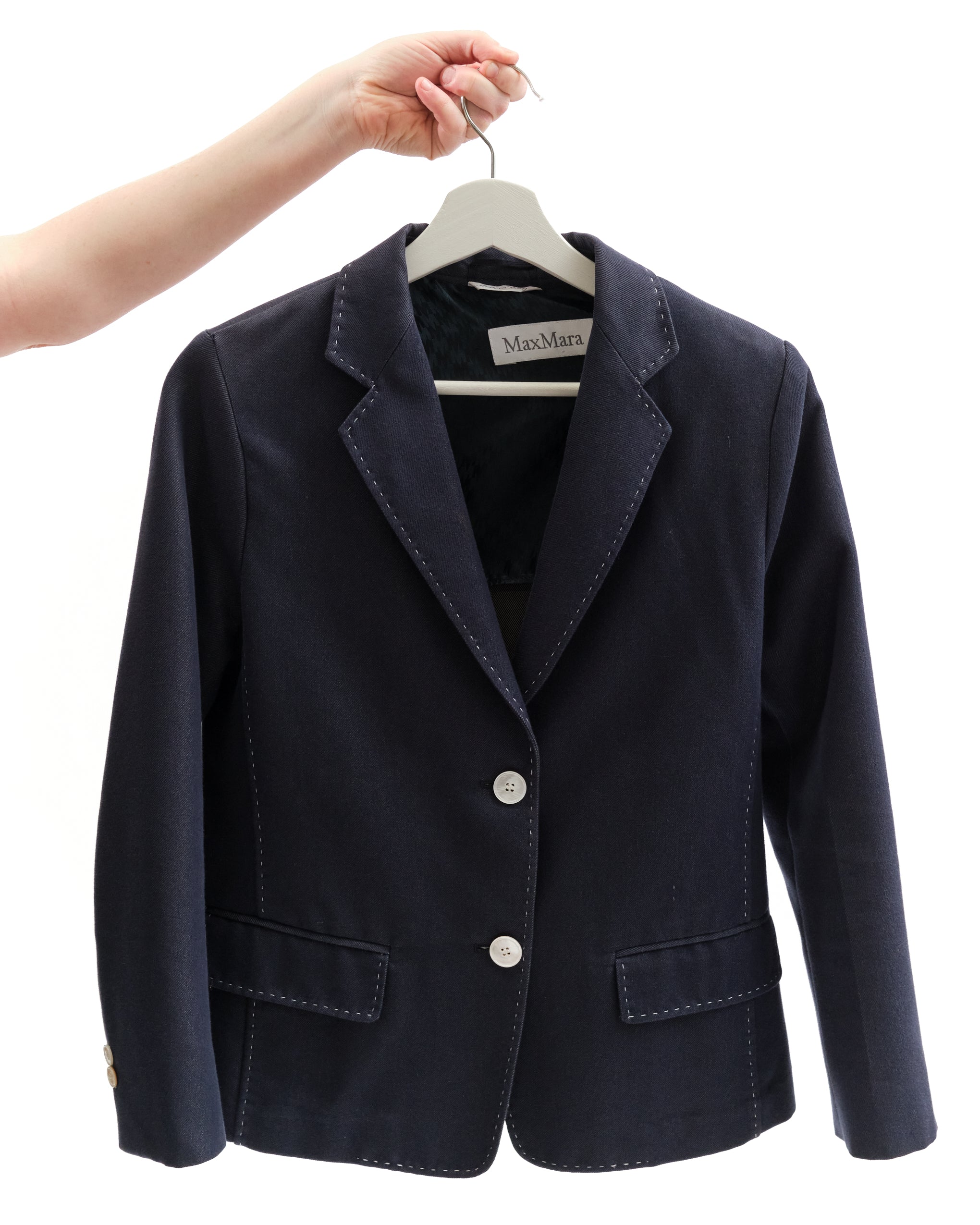 Blue "denim" blazer by Max Mara. Notched lapels with contrasting white stitching at borders and opening, at bust seams, pockets, vertical back seams and at back pleats on both sides. Slight padding at shoulders. Single breasted with double large pearly buttons. Double decorative buttons at cuffs. Flap pockets at waist, kick pleats at back at each side. Arms and upper back are lined in black houndstooth fabric. Single inner pocket. Labels read "Max Mara, made in Italy. Size 10." Model is an xs.