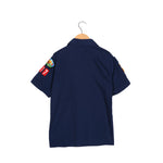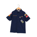 Collared vintage navy Boy Scouts short sleeved shirt. Patches on each sleeve- one reads "Great Council BSA" and has a cityscape, with numbers "3177" below it. On other sleeve is an American flag, "Den 6" in a golden rectangle, and "Q-Quality Unit 1989." Button-up, embossed navy buttons. Buttoned chest patch pockets. On right side, above pocket reads "Boy Scouts of America." On left side are gold star pins which say "1" and "2." There is a cross with a fleur de lis and small hanging banner on pin which reads "1 year." On right chest pocket, two appliquéd patches in blue and green of a Bobcat and a bear. Cuuuuuute.
