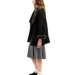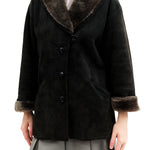 Shawl-style collar with light grey exposed shearling. Highly cut, with single off-center blue black marbled button. Lengthwise buttons. Seams on either side of opening. Angled slit pockets at waist. Dropped shoulders. "Fur" light grey cuffs. At back, seams from tops of shoulders angled inwards at waist. Seams on back of sleeves. Cinched waist via double navy strings at back with brass toggle. Interior is soft fur underside of shearling. Label reads "Shearling. Guaranteed Original. The best of the best. Size 38."