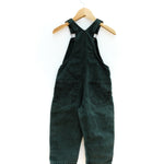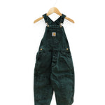 Faded deep green Carhartt overalls. Very sturdy, thick fabric. Adjustable overall straps with bronze hardware, as well as bronze snaps. Front pocket on bib with Carhartt patch. Bronze snaps at side of waist. Angled pockets and buttoned fly. Knee patches. Pockets on bum. Label reads "3T. Machine wash warm. 100% cotton."