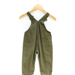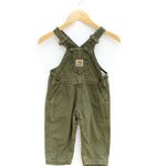 The littlest faded green Carhartt overalls. Sturdy green canvas. Adjustable straps with bronze hardware, and "Carhartt" embossed snaps at top. Bib with front pocket and Carhartt patch. Side snaps at waist. Waistband seam and angled pockets. Adorable tapered legs with snap opening. Labels reads "Carhartt, 12 months, 100% cotton, machine wash."