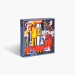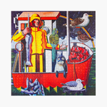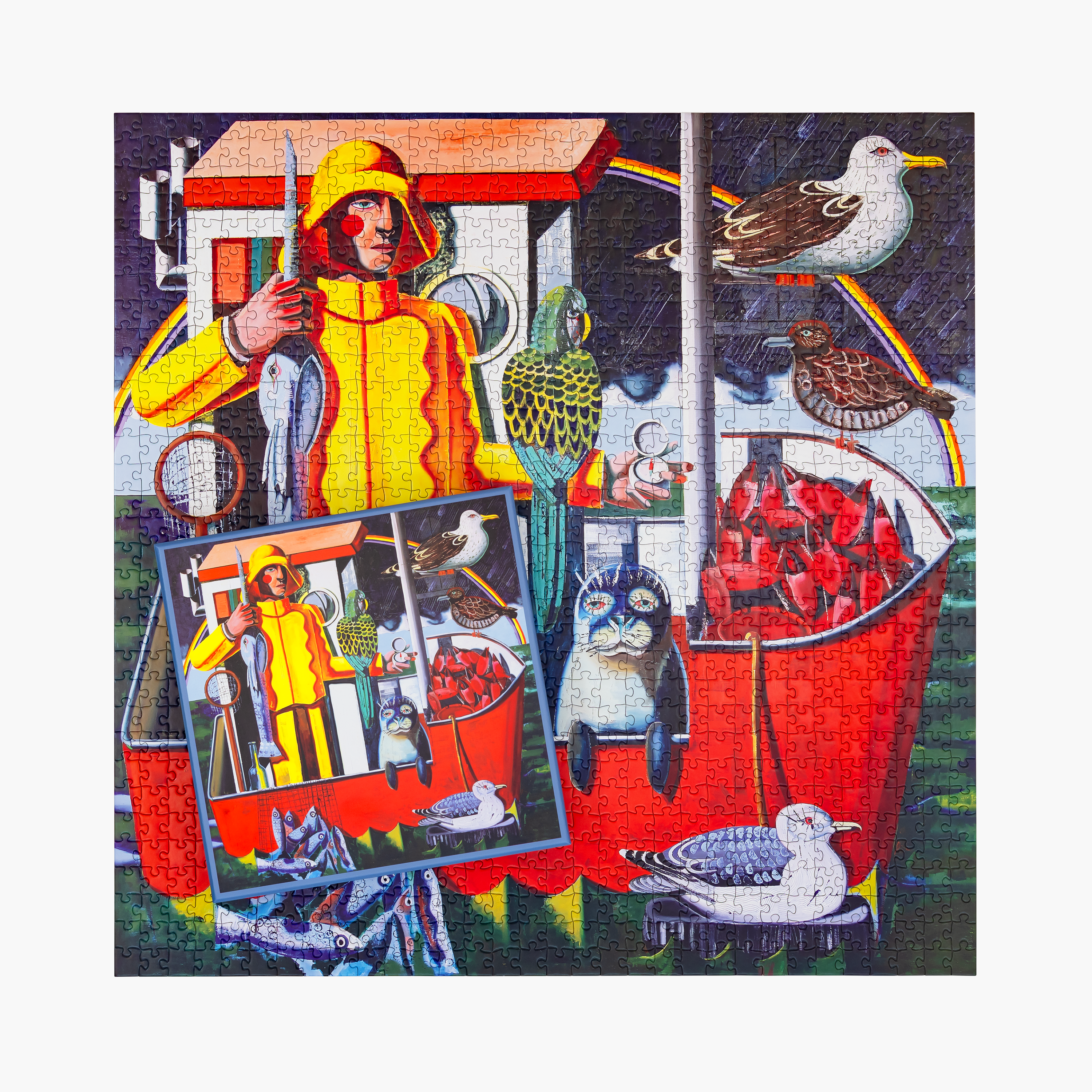 This 1000 piece, 25" (63.5 cm) square puzzle, titled Vissersboot (Fishing Boat), depicts a fishing boat that has been lost in stormy weather. The dark and foreboding sky is contrasted by a colorful rainbow and the sailor is accompanied by a cast of various sea life. Kristof’s trademark flattened perspective and exaggerated scale of the boat add a playful quality to the piece.