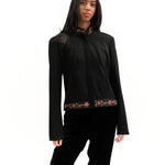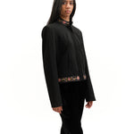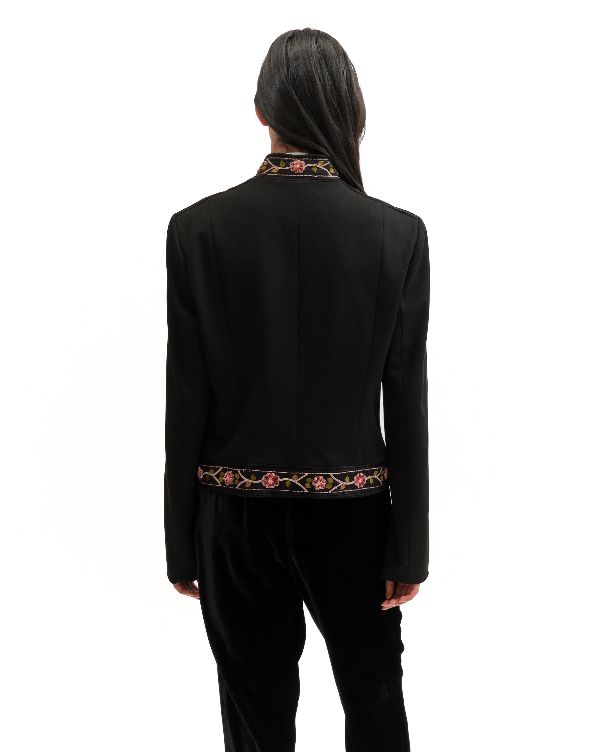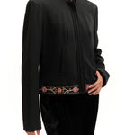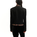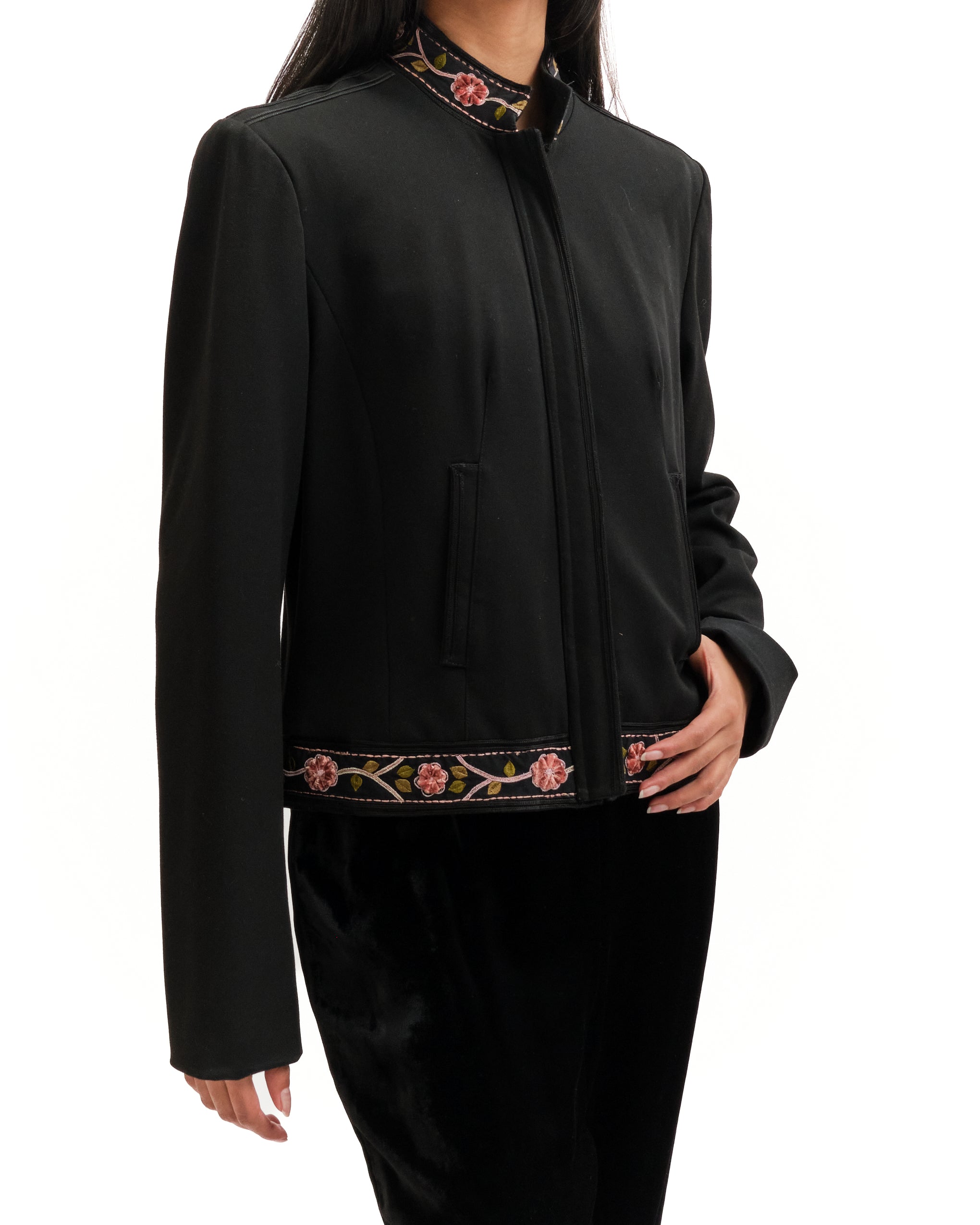 Y2K Vertigo jacket. Stand-up collar, with hand stitched pink "band." Small pink velvet flowers with vines, sage leaves- repeated at hem. Padding at shoulders. Shoulders have two double bands of piping from collar to shoulder. Curved seams from underarm to hem, as well as curved seams from bust to hem. Cropped, waist-grazing length. Lengthwise zipper, with matte silver tag embossed with "Vertigo." Triple seams at back. Jacket is lined. Labelled a large, content label is worn off. Dry clean ony. Model is an xs.