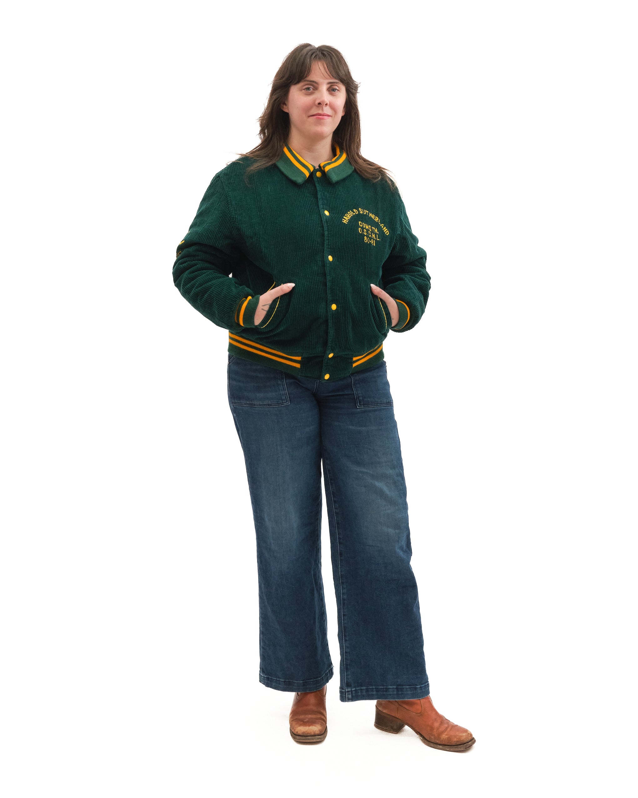 Wide wale deep green corduroy vintage varsity jacket. Ribbed green and yellow double striped collar, hem and cuffs. Yellow lengthwise snaps. Angled, slit pockets at waist, piped in yellow. On left chest is "Harold Sutherland Constn. O.S.CH.L. 80-81." Label reads "All Star Jackets, Toronto, ON." Hockey sticks embroidered on right arm, with "Scout."