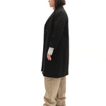 Notched lapels, highly cut. Triple button button-up. Bevelled buttons. Single breasted. Diagonal seam from shoulder to hips, with slit pocket integrated into seam. Slit flare at hemline. Some padding at shoulders. Single seam down back and backs of sleeves. Label reads "Lisa Fashions, Toronto, Canada." No size label.