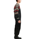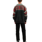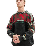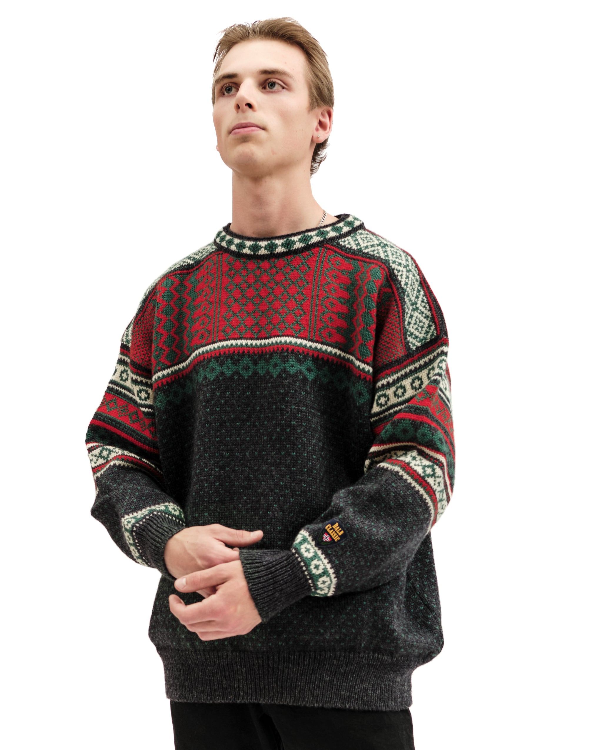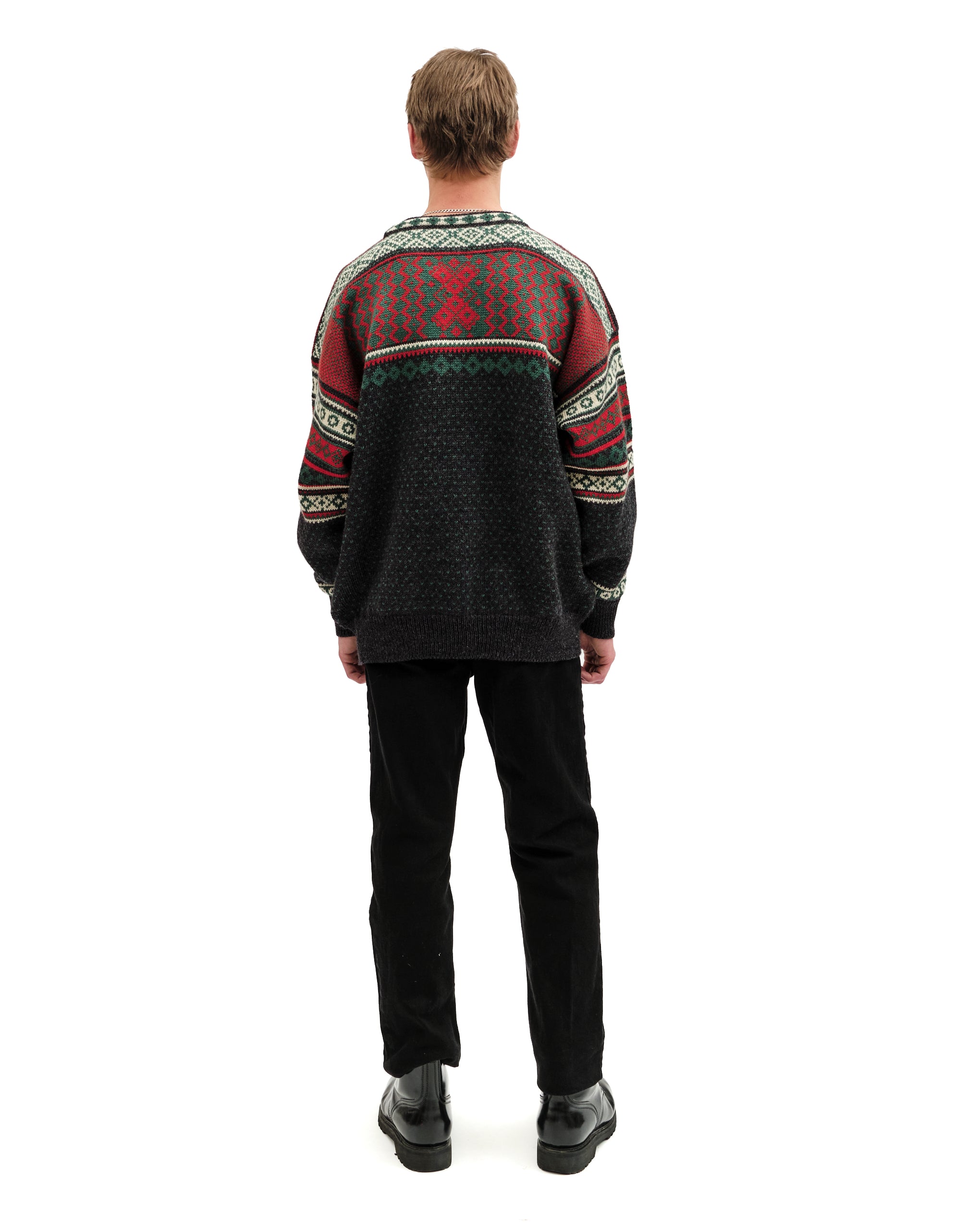 Charcoal grey, green, cream and rusty orange Dale of Norway knit. Crew neck with green diamond knit border. Green and cream triangle knit shoulder "yoke" with orange and green patterned knit chest. Green diamond and white stripe border, with grey body...with grren dots. Trying to write about knits is difficult? Haha. Ribbed grey hem and cuffs. Dropped shoulders. Dale of Norway crest on left sleeve. Label reads Dale of Norway, 100% wool, xl. Model is a small.