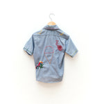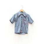 70's blue children's shirt, with long collar and short sleeves. Black button-up. Patch pocket on chest with pink embroidery. On left chest, small embroidered mushroom with patches of grass. Purple stitching around collar. Back has tiny embroidered yellow birds at shoulders. Back has an ice cream cone in middle (I am dead) as well as a red snail and colorful parrot. Bah! Sleeves have stitching in two different greens. Label reads "Kmart, 8, 50% cotton, 50% polyester."