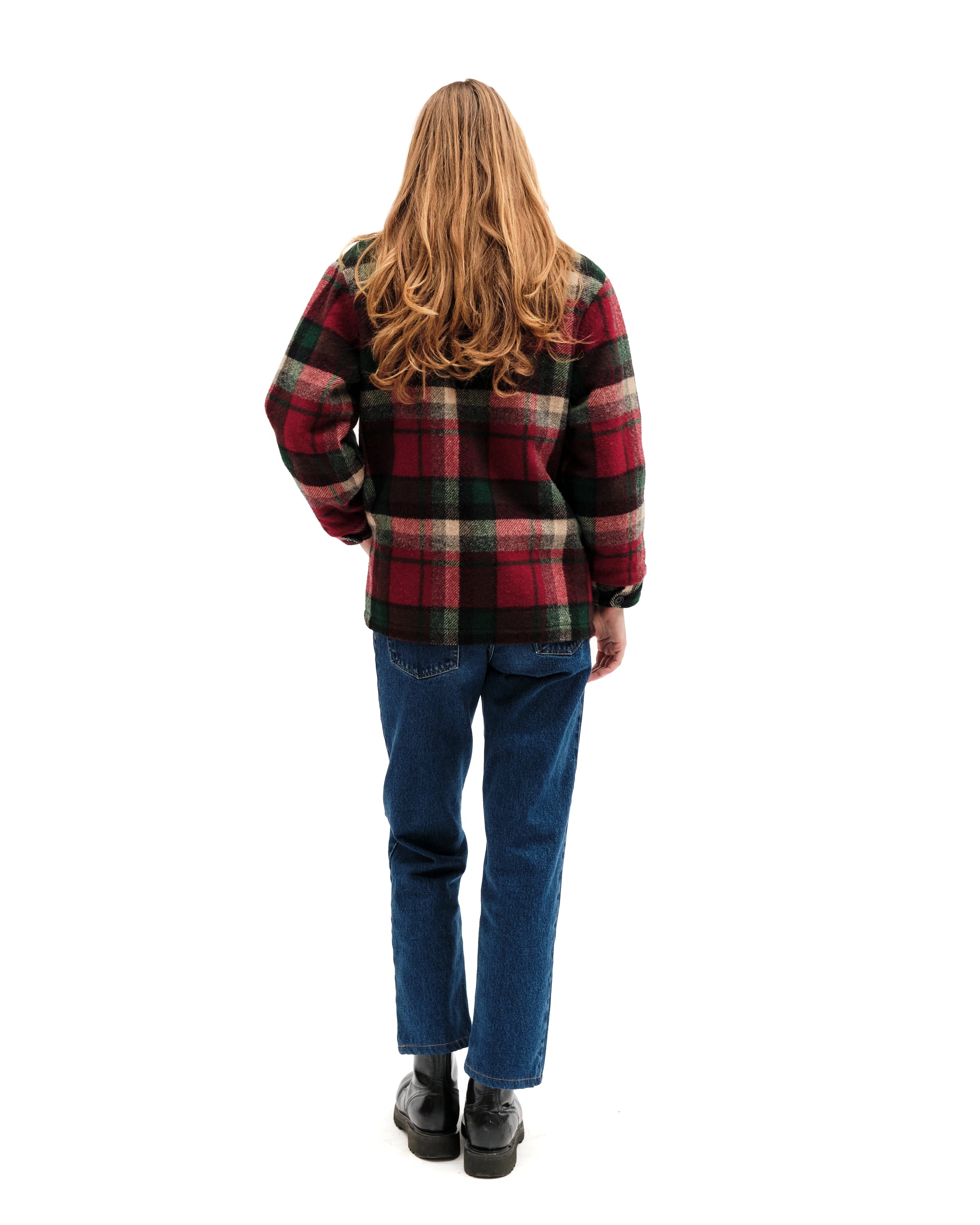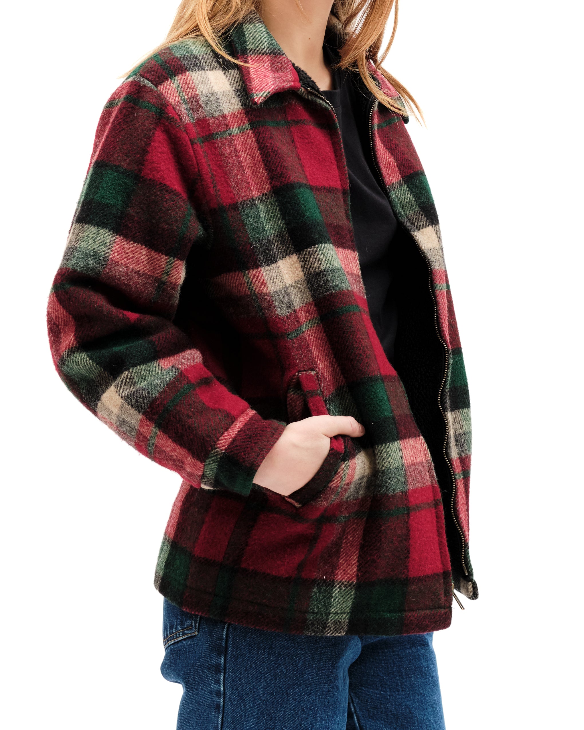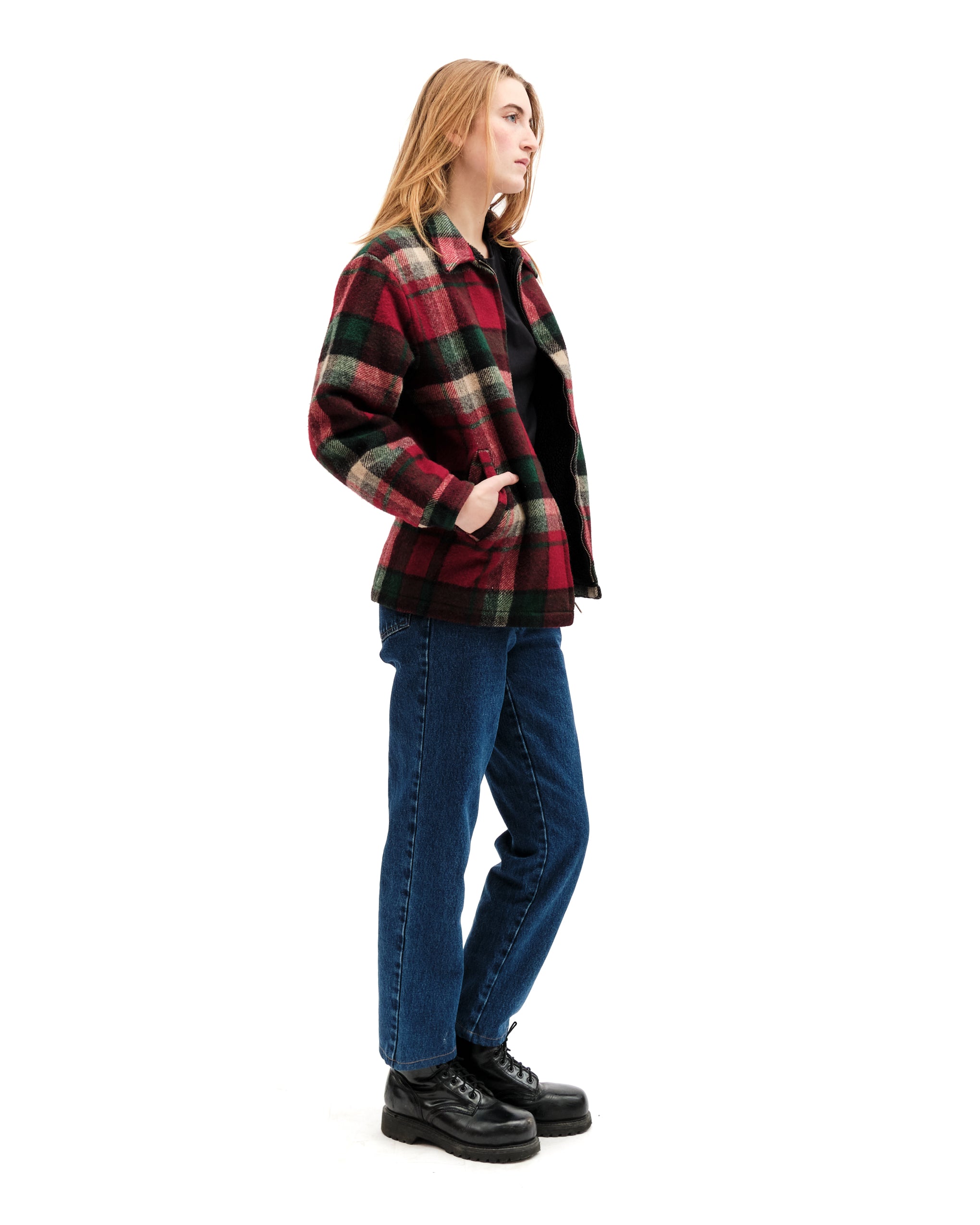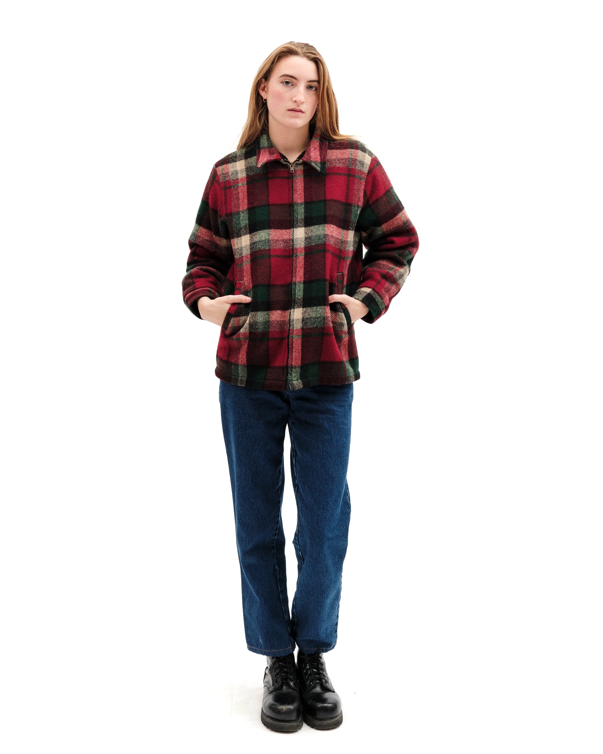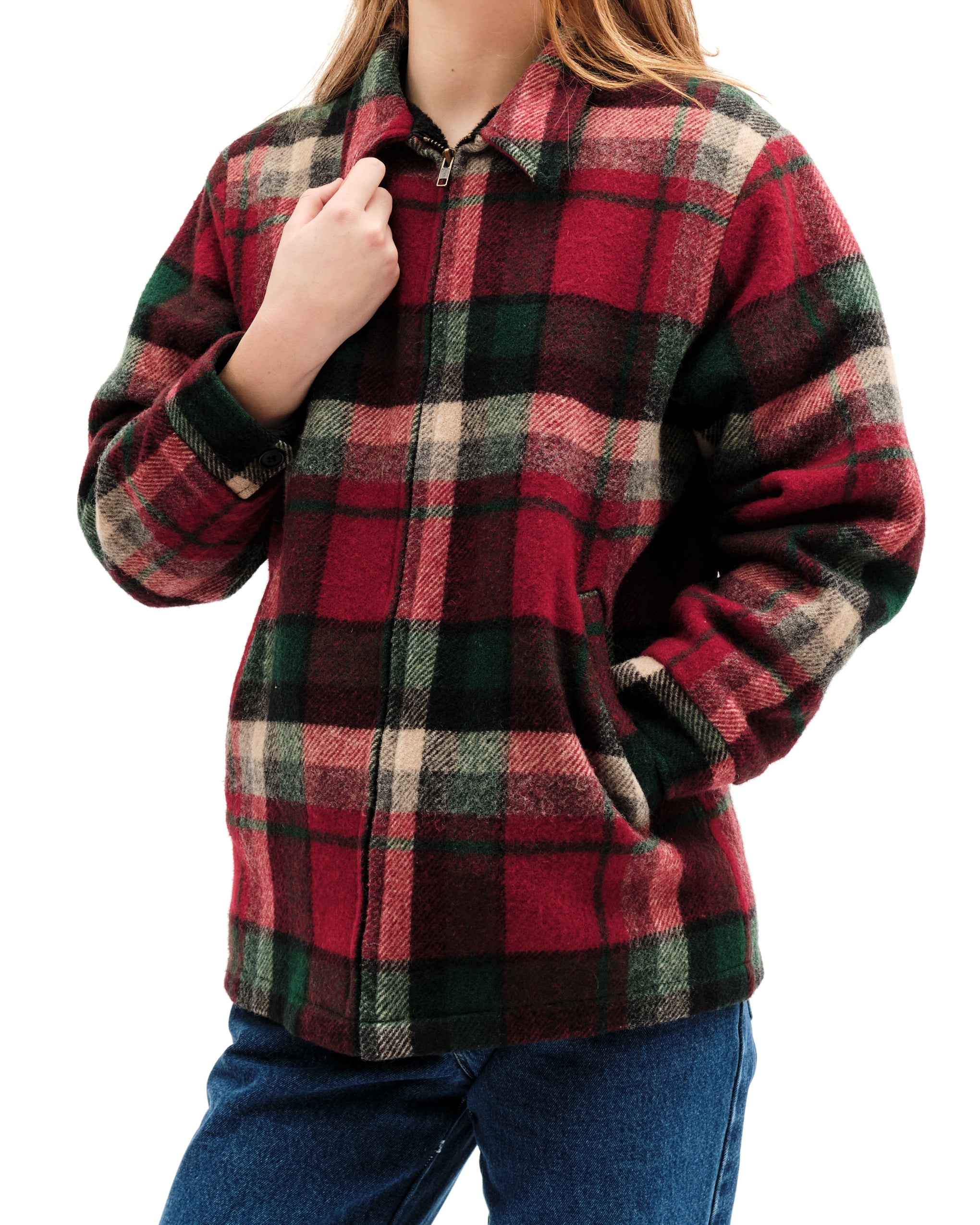 Collared plaid wool Woolrich jacket. Plaid is a strudy red, deep green, light grey and black plaid. Angled pockets at waist. Lengthwise bronze zipper. Buttoned at cuffs with faux fur lining. label reads "Woolrich, size small, made in USA. Fleece lined pockets. Model is an xs.