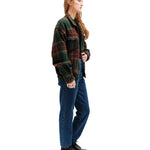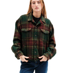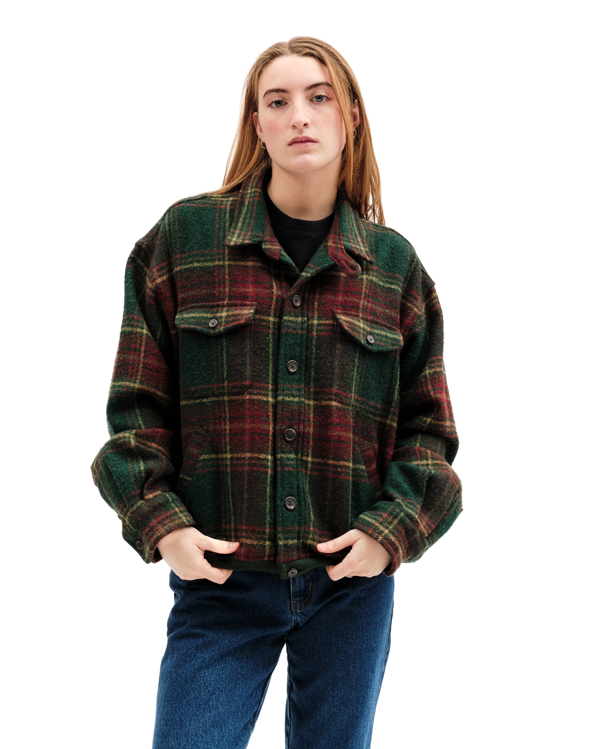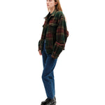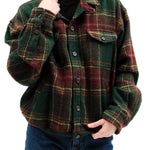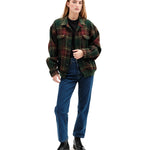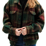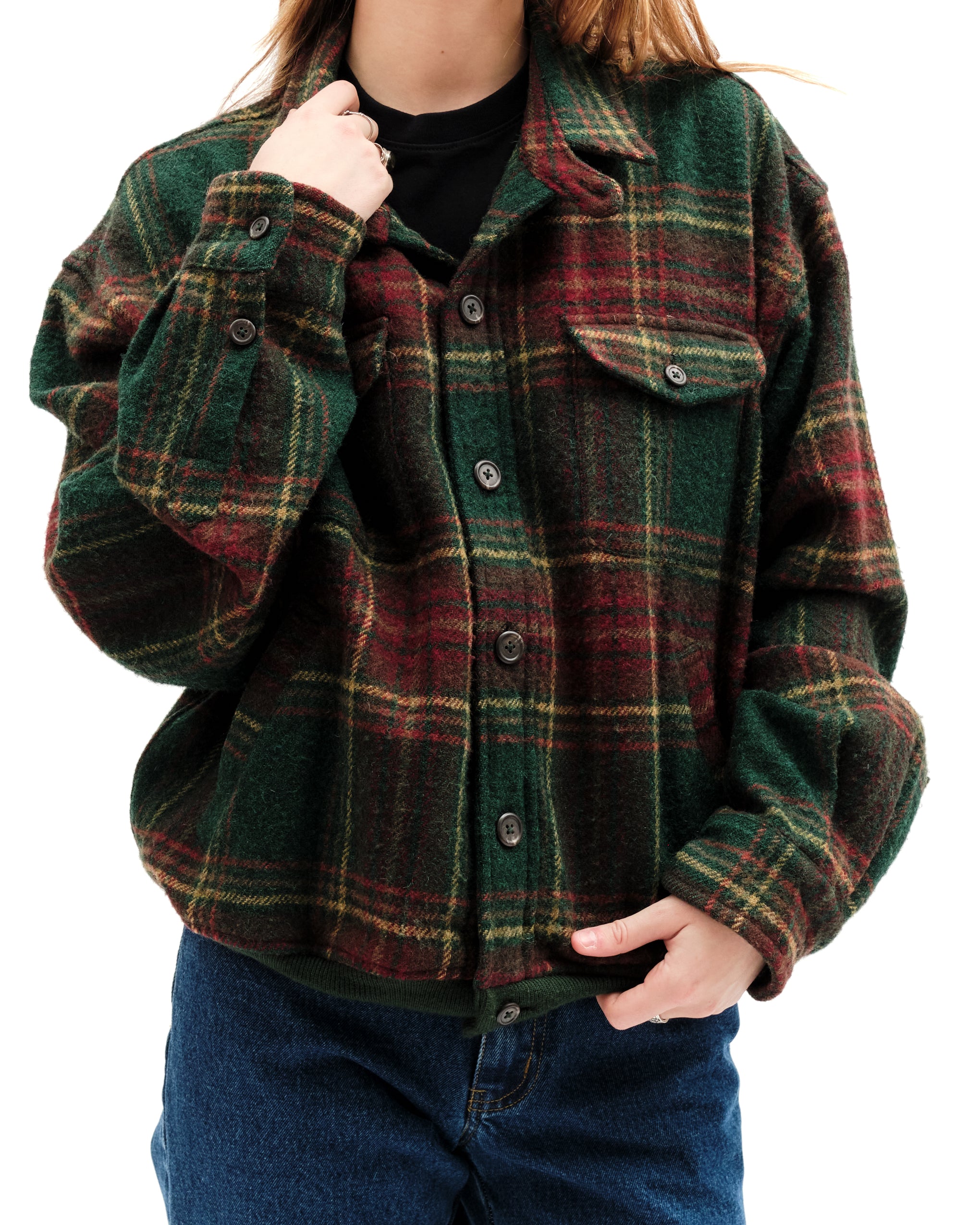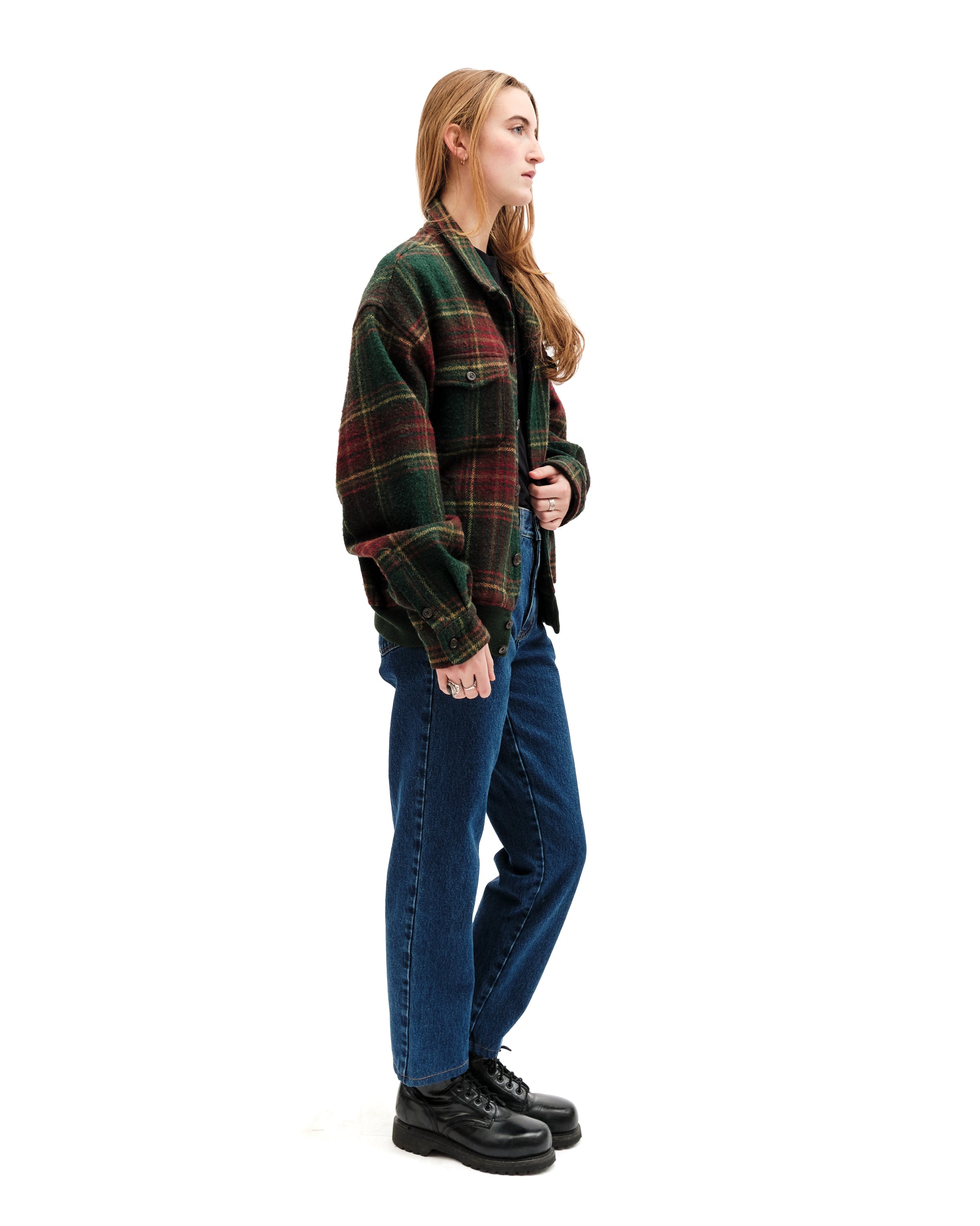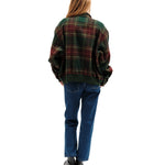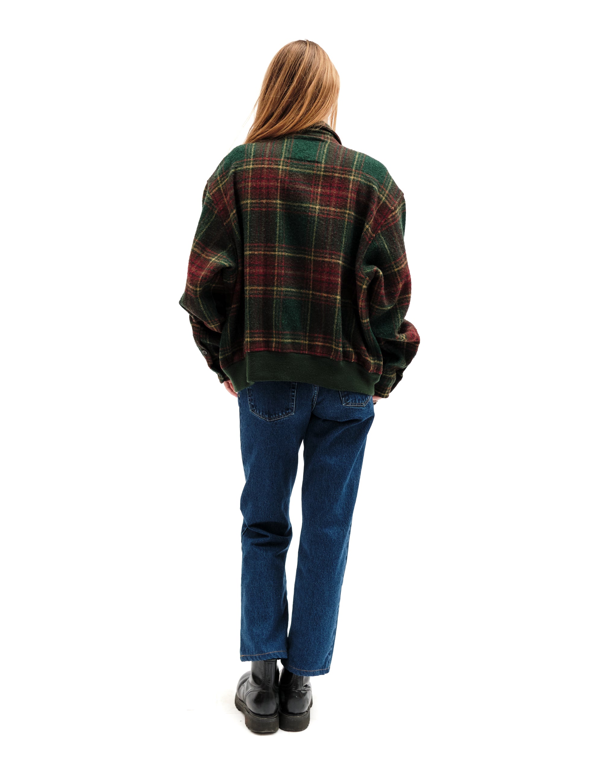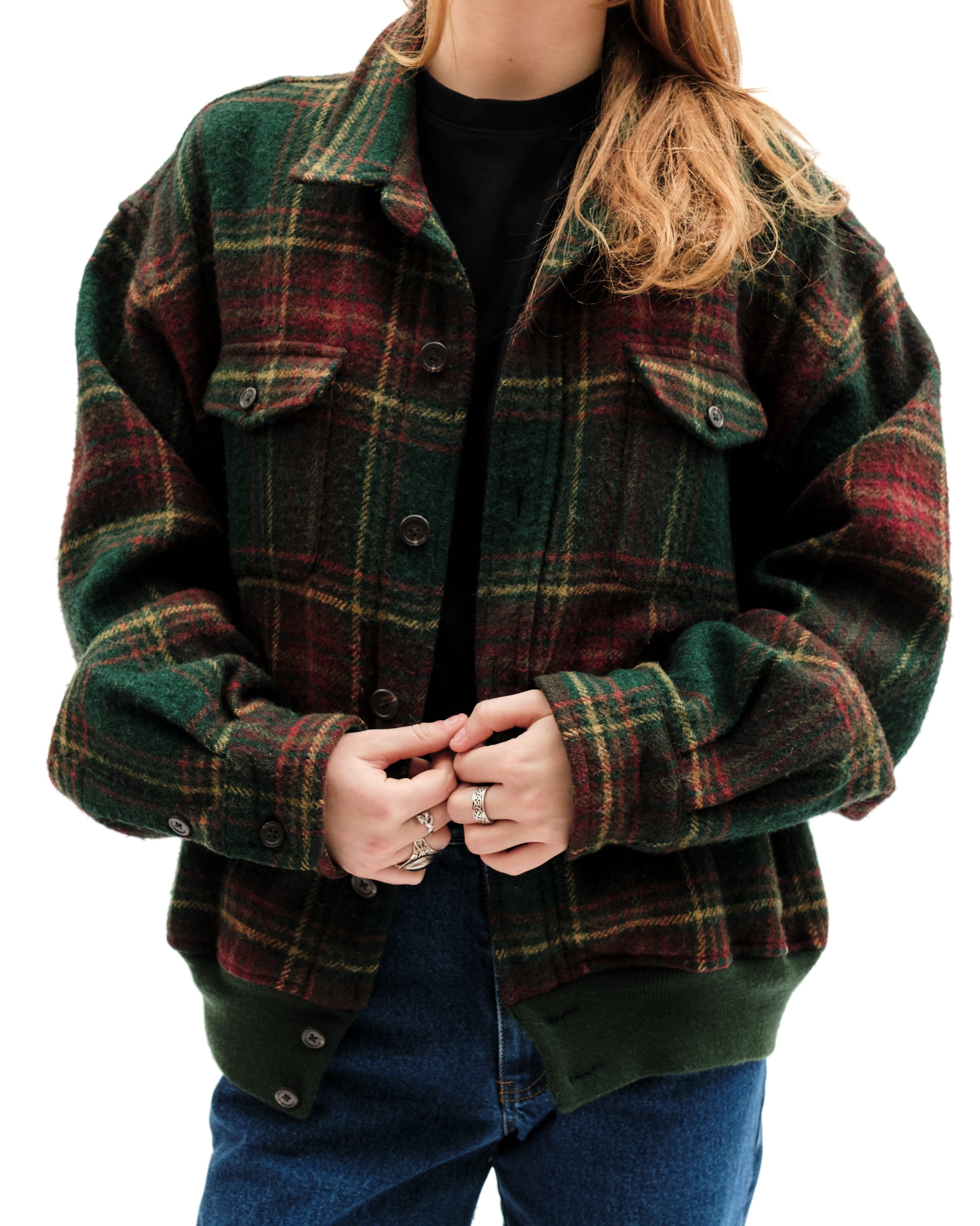 Vintage Polo Sportsman bomber. Plaid wool fabric, dark green, red, peach and deep yellow tartan. Angled waist pockets. Buttoned strap at neck, lengthwise button-up. Marbled grey buttons. Buttoned chest flap pockets, dropped shoulders. Buttoned cuffs. Ribbed deep green hem. Unlined. Label reads "100% wool, large. Dry clean only."