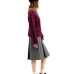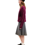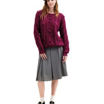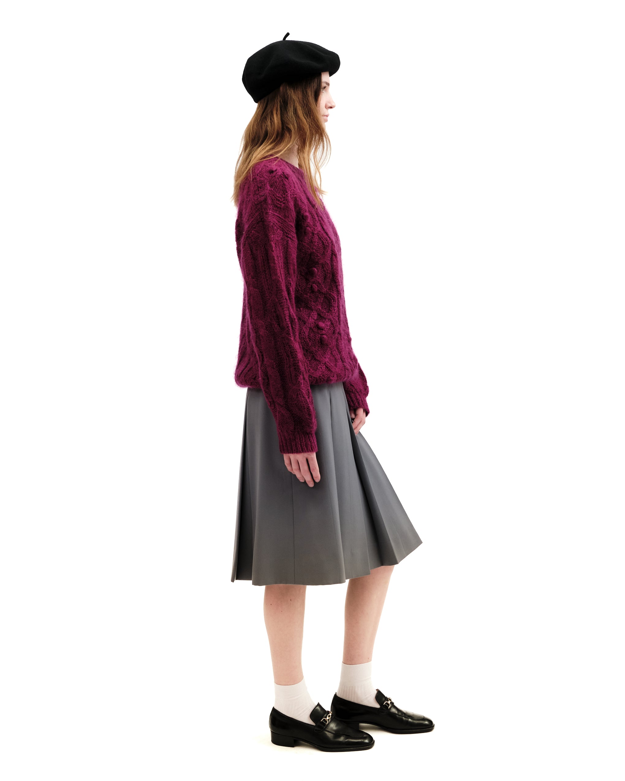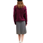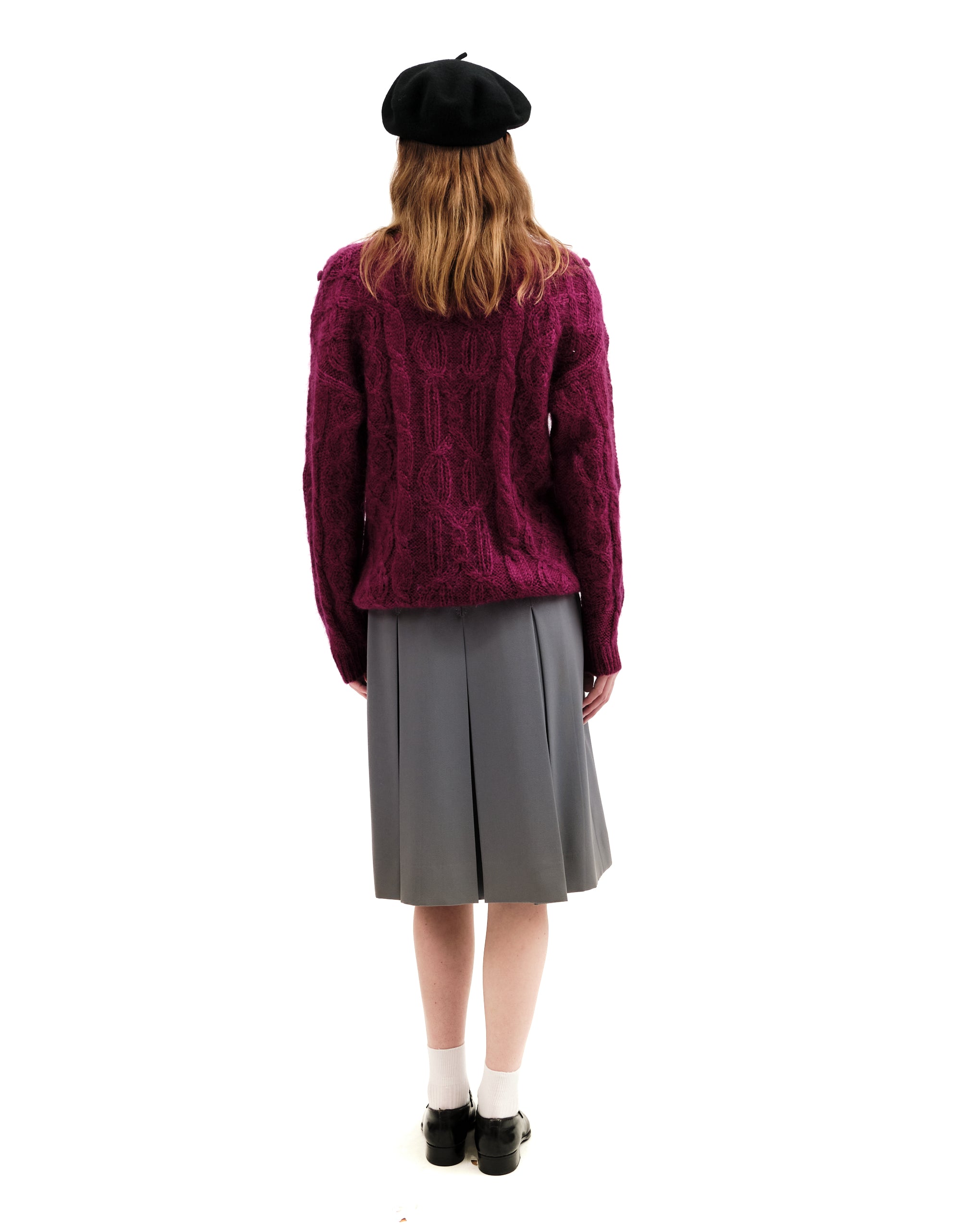 Vintage raspberry mohair sweater by Northern Isles. Boat-crew neck, ribbed. Ribbed cuffs and hem. Lovely and amazing and wonderful cabling with large popcorn ball knit. Dropped shoulders. Amazing fuzzy mohair. Content and care label rubbed off.