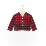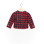 Vintage red plaid blazer-jacket. V-neck, single-breasted button-up with large cream buttons. Slit pockets at waist that are real hahah. Curved opening. Decorative button at cuffs. Lined in a champagne hued fabric, label reads "Oxford Quality Tailored, 4."