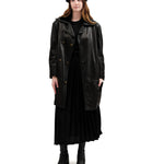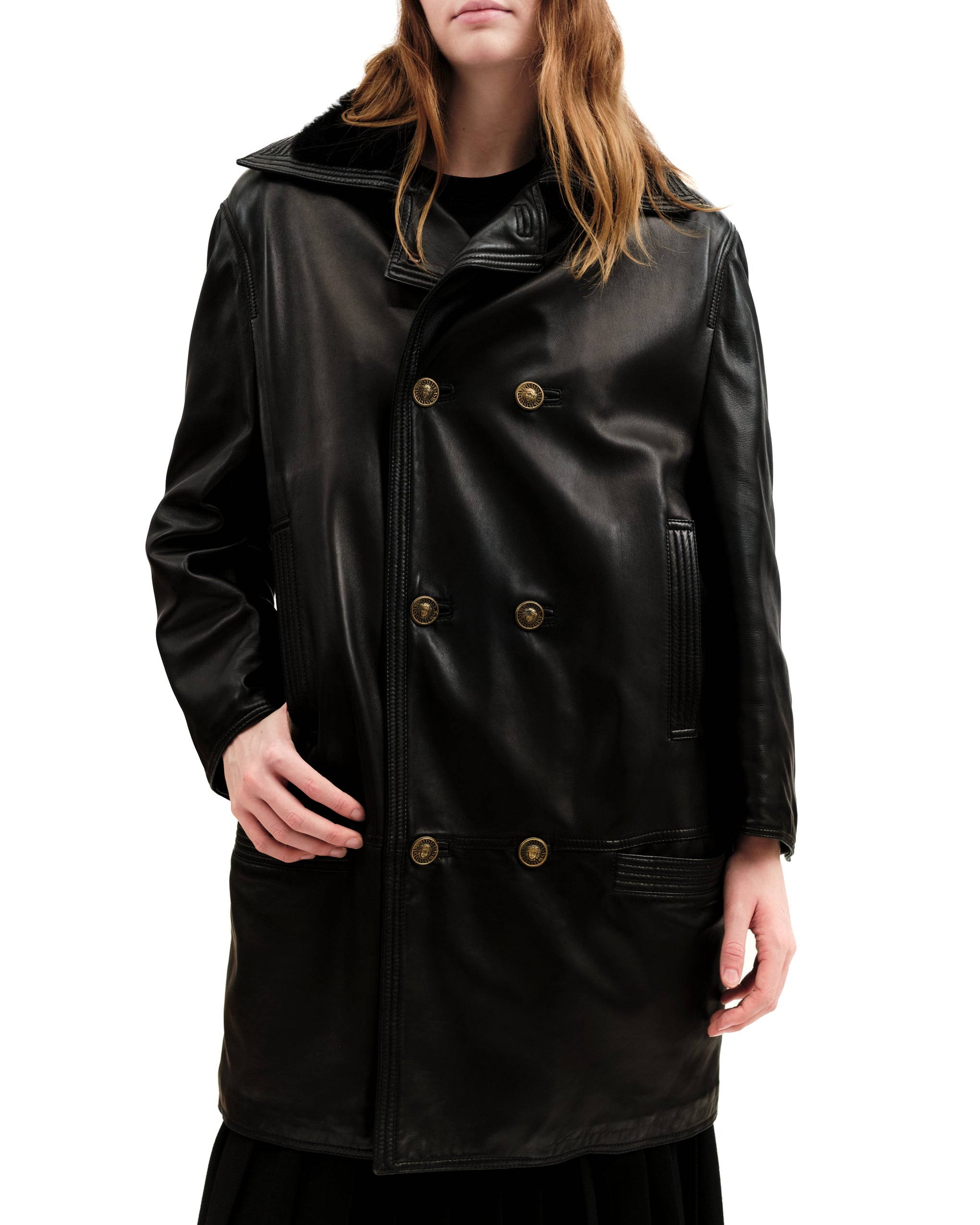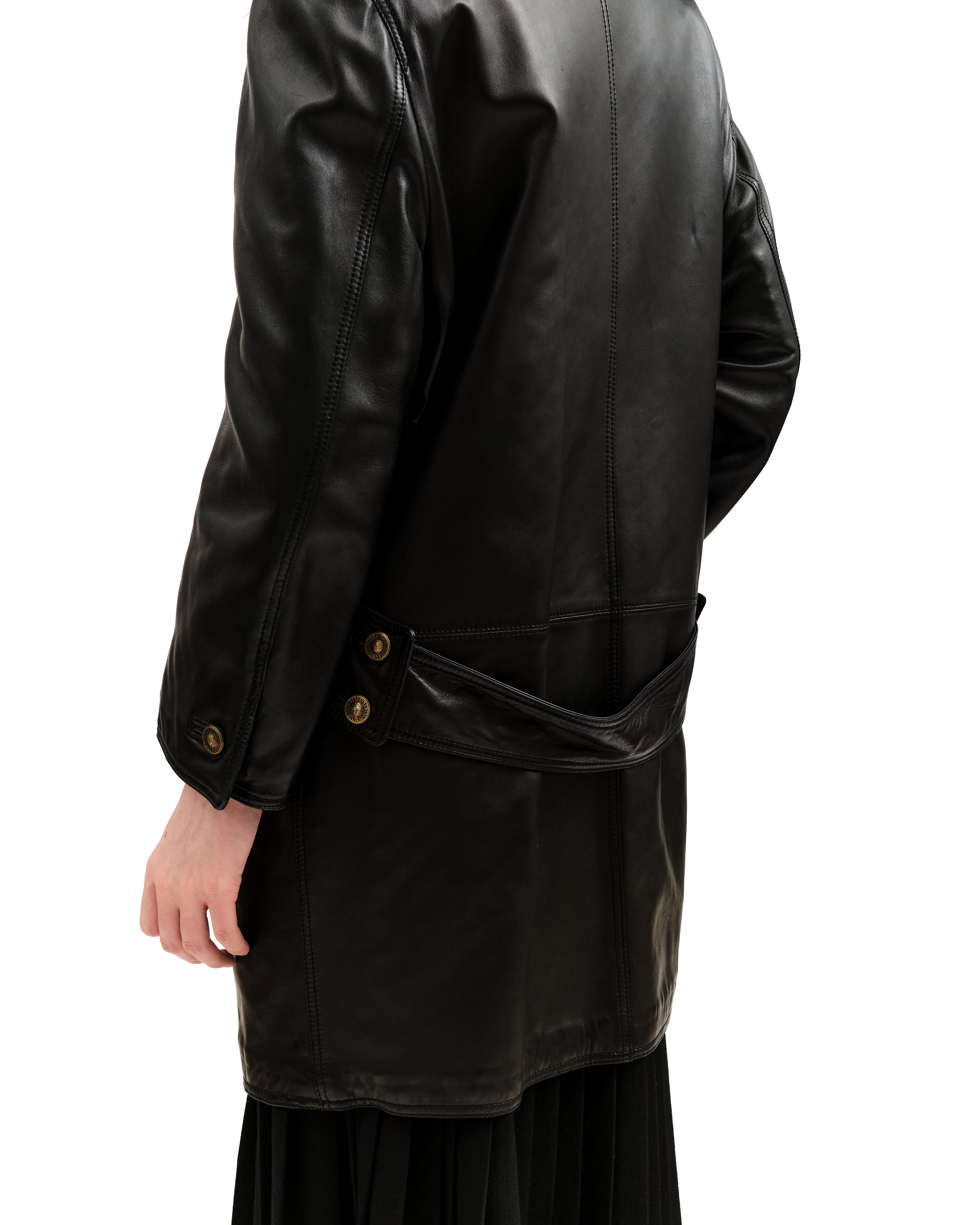 Black fur notched collar, highly cut, with stitched leather piped borders. Stitched border at pockets, opening, cuffs, hemline. Double breasted, with matte bronze buttons of the house's signature medusa emblem. Slit vertical mid-body pockets, as well as horizontal waist pockets. Horizontal seam at hips. Slit cuffs with single bronze button. Single seam down centre of back. Slouchy attached belt at lower back, with two sets of bronze buttons at either side. Some padding at shoulders. Gianni Versace label on interior. No content/care label. Charcoal quilted lining.